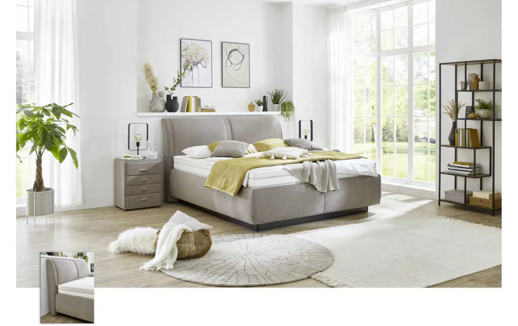 - Gegen Mehrpreis erhältlich: Nachtkonsolen, Lampen, Kissen und Plaid