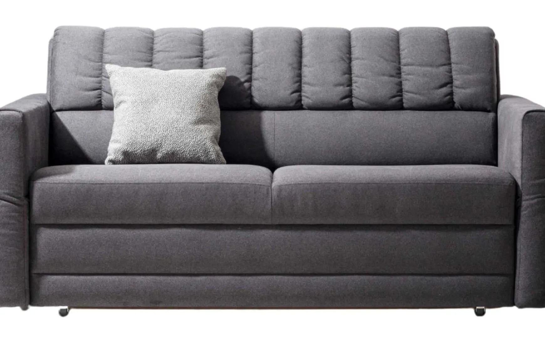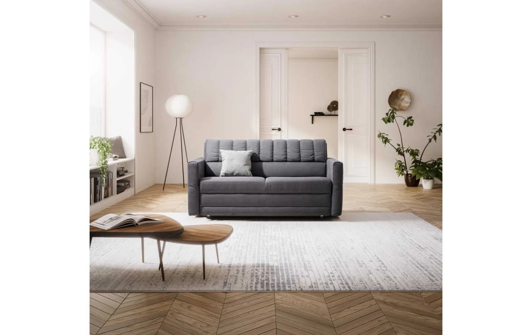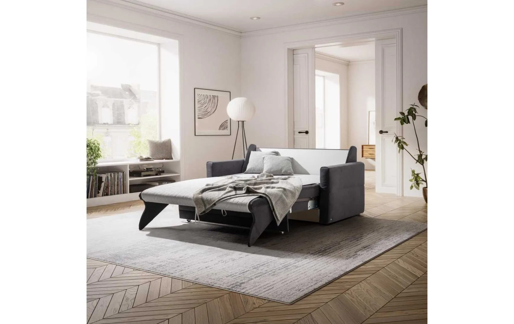 Mit diesem Schlafsofa bereichern Sie Ihr Wohnzimmer um ein elegantes Möbelstück. Der Bezug der Couch sowie die 2 Armlehnenkissen sind in schlichtem Anthrazit gehalten. So lässt sich das Sofa in jede Einrichtung integrieren und macht besonders in Ihrem Wohnzimmer eine gute Figur. Im Innenleben der Couch befindet sich eine Federkern-Polsterung mit einer Wellenunterfederung. Dank des hochwertigen Materials hat das Sofa selbst bei hoher Beanspruchung eine lange Nutzungsdauer. Der Bezug aus reinem Polyester macht das Sofa resistent gegen Abreibungen und Verschmutzungen. Kündigen sich spontan Gäste an, sind Sie mit diesem Schlafsofa bestens vorbereitet: Die 2 großen Sitzflächen lassen sich in wenigen Schritten in ein ca. 130 cm breites Bett verwandeln. Integrieren Sie dieses Schlafsofa in Ihr Zuhause und genießen Sie seine vielseitigen Vorteile! Gegen Aufpreis erhalten Sie in unseren Filialen zahlreiche Varianten, Farbalternativen, Zubehörteile und Beimöbel.