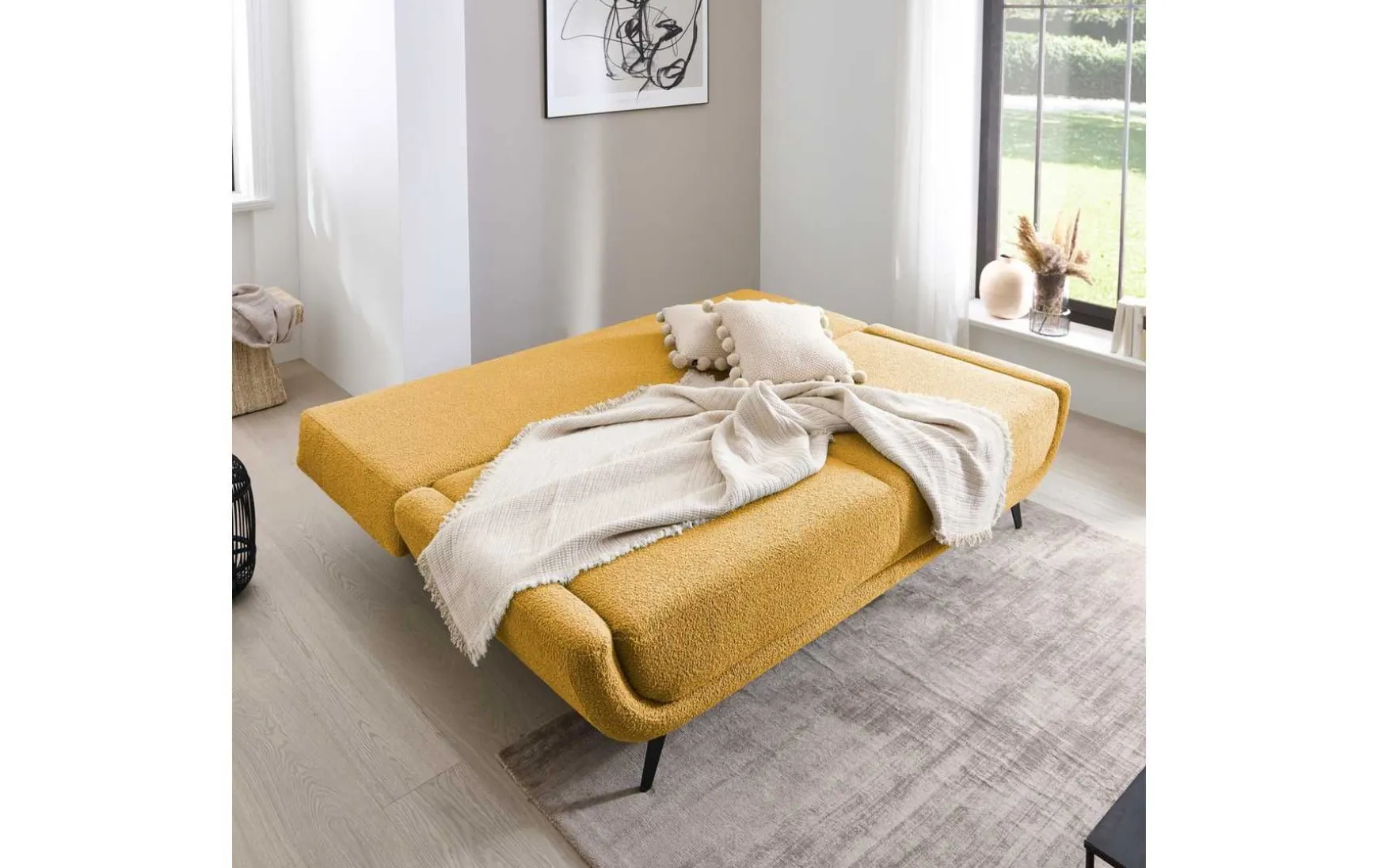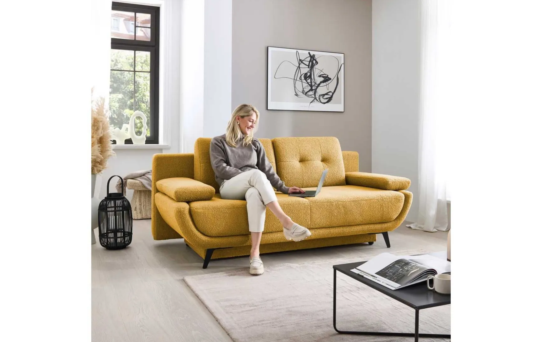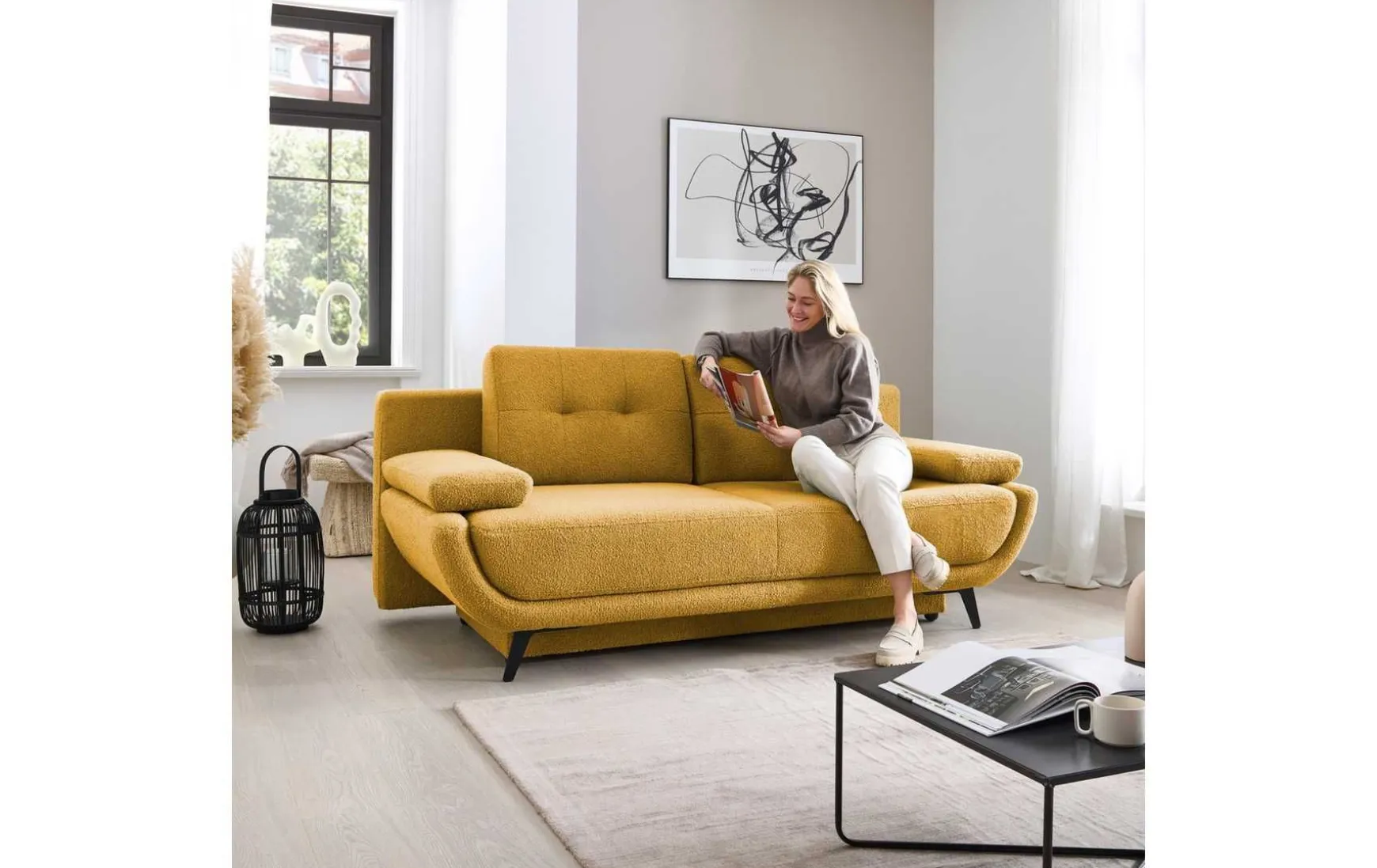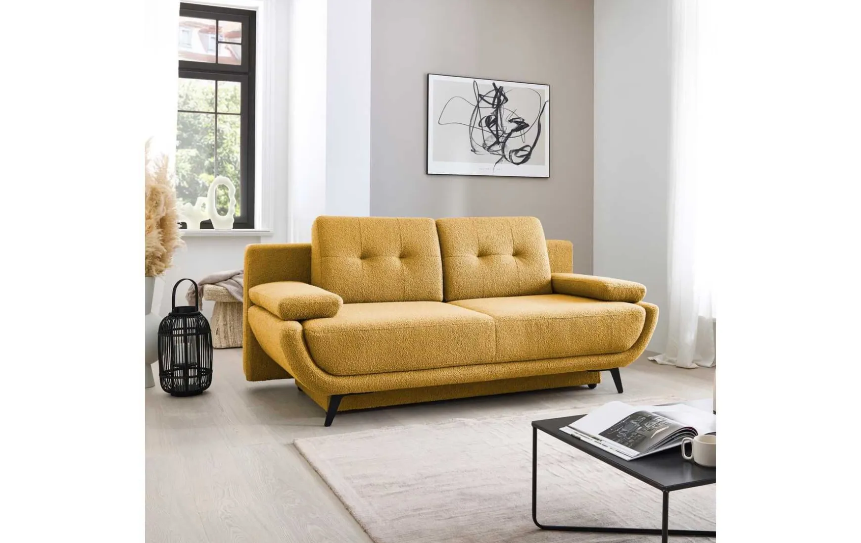 besticht durch ein ausgefallenes, abgerundetes Design und dem angenehm weichen Stoff. Ob für einen gemütlichen Mittagsschlaf zwischendurch oder als Übernachtungsmöglichkeit für Ihre Gäste, die bequeme Schlaffunktion macht es möglich. Die Sitzhöhe ist mit der Liegehöhe identisch, so haben Sie eine optimale Liege- und Aufstehhöhe. Das Highlight an diesem Schlafsofa ist der integrierte Hubbeschlag, damit wird das Auf- und Zuklappen zum Kinderspiel. Heben Sie einfach das Sofa von unten mittig an und ziehen Sie die Bettfunktion ohne große Anstrengung raus. Der geräumige und belüftete Bettkasten bietet ausreichend Platz für Ihre Decken und Kissen. Mit der hochwertigen Federkernpolsterung und dem bequemen Lattenrost, werden Ihr Besuch und Sie geruhsame Nächte verbringen. Bringen Sie mit diesem stylischen Schlafsofa neuen Pep in Ihr Gästezimmer. Genießen Sie erholsame Nächte und starten Sie mit neuer Energie in den Tag.