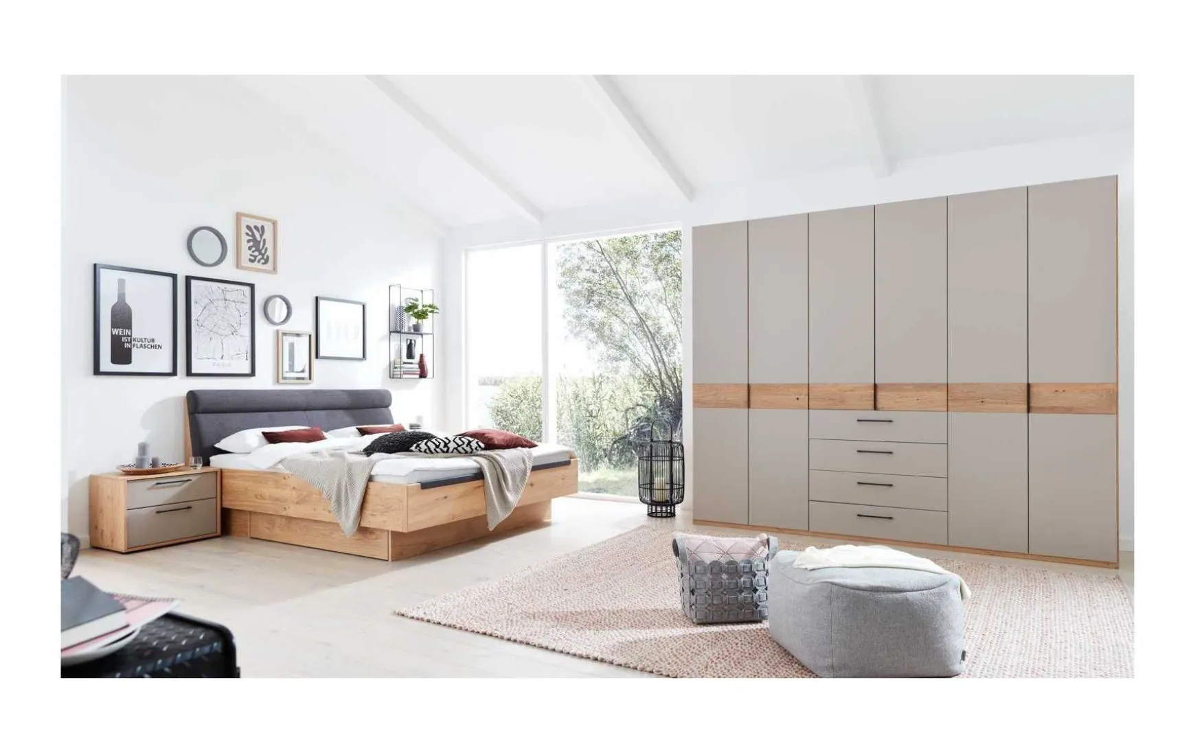 - Im Preis enthalten: 6-türiger Drehtürenschrank, Bett inkl. Polsterkopfteil, Nachtkommoden