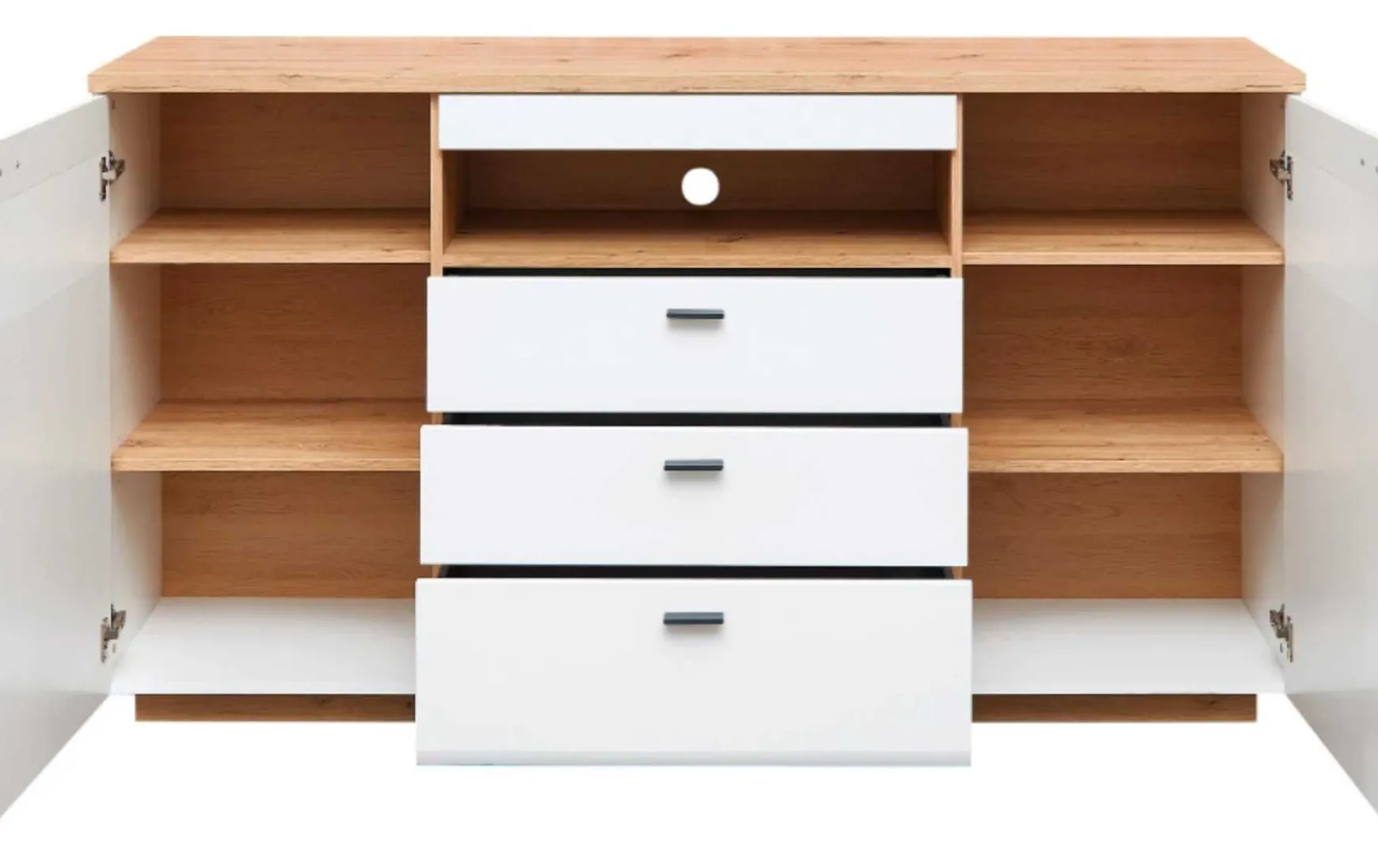 Modern und schlicht präsentiert sich dieses Sideboard in einem angesagten Mix aus Holz und Weiß. Es besticht durch seine schöne Oberfläche und dem großzügigen Stauraum hinter zwei Türen, in drei Schubladen und einem offenen Fach.