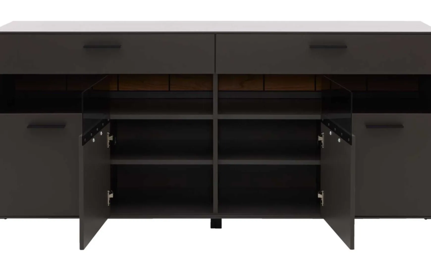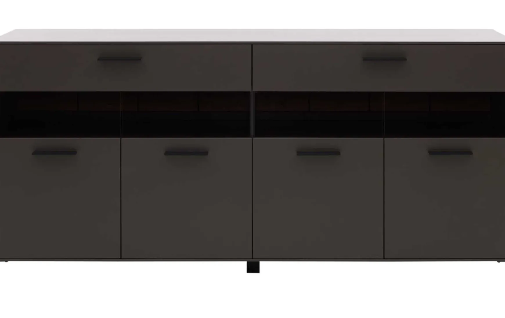 Das Sideboard überzeugt mit seinem stilvollen Design und der hohen Qualität. Seine wolframgrauen Lackoberflächen strahlen moderne Eleganz aus. Für das gewisse Etwas sorgen die Einsätze aus grauem Parsolglas, die sichtbaren Rückwände mit Spaltholz auf schwarzer MDF und die Details aus schwarz lackiertem Metall mit Feinstruktur. Hinter den vier Holztüren mit edlem Glaseinsatz im oberen Bereich befinden sich sechs Holzböden. Zusätzlich verfügt die Kommode über zwei Schubladen. Sie erhalten das Sideboard mit Maßen von ca. 180 x 86 x 45 cm (B/LxHxT)