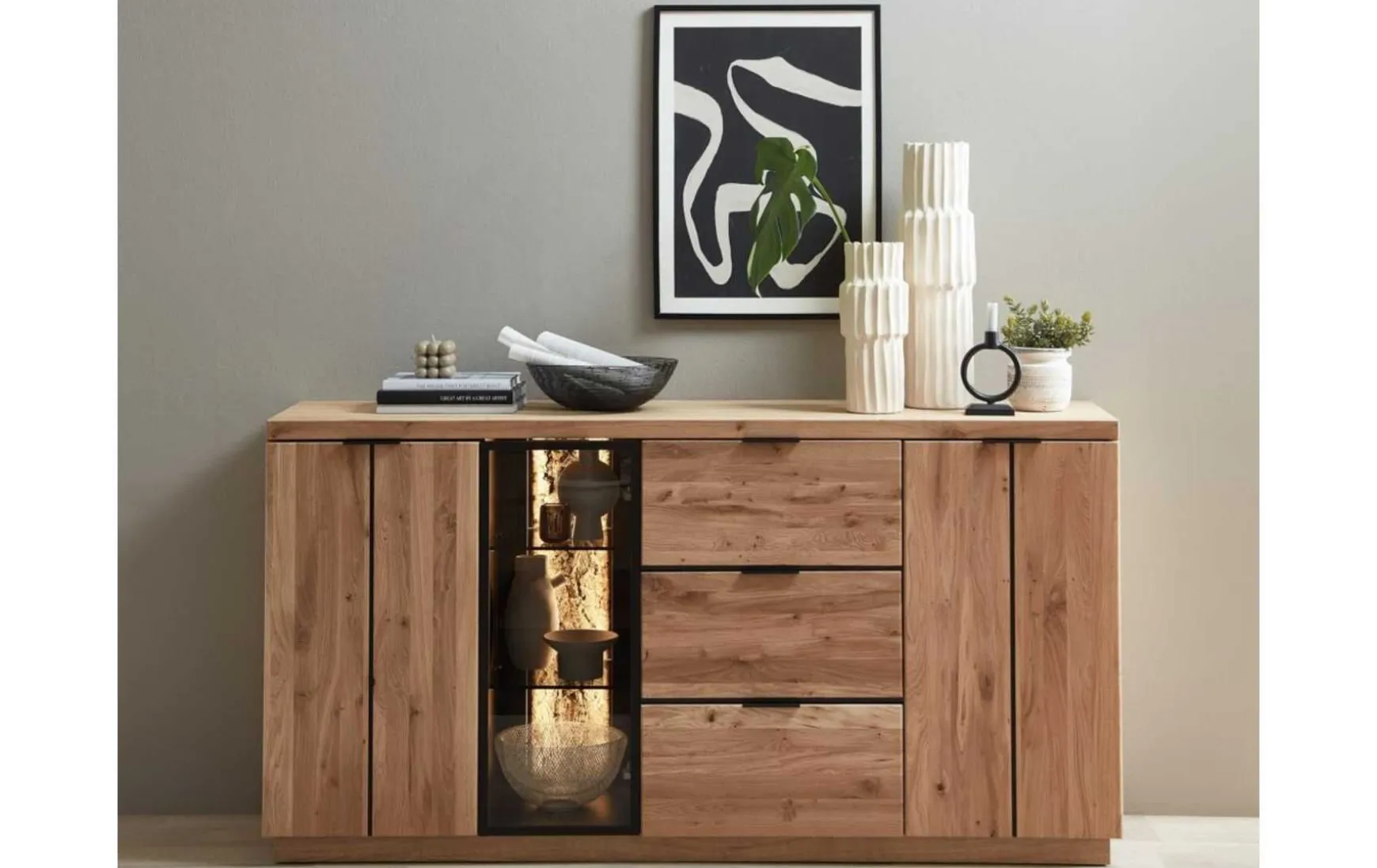 Das Sideboard vereint zeitloses Design mit hochwertigen, natürlichen Materialien. Gefertigt aus massivem Wildeichenholz und ergänzt durch fein furnierte Elemente aus Echtkork in Bianco, entsteht eine harmonische Kombination aus Wärme und moderner Eleganz. Die natürliche Maserung der Eiche wird stilvoll durch die weiche Struktur des Korks ergänzt – ein echtes Highlight für jedes Wohnambiente.