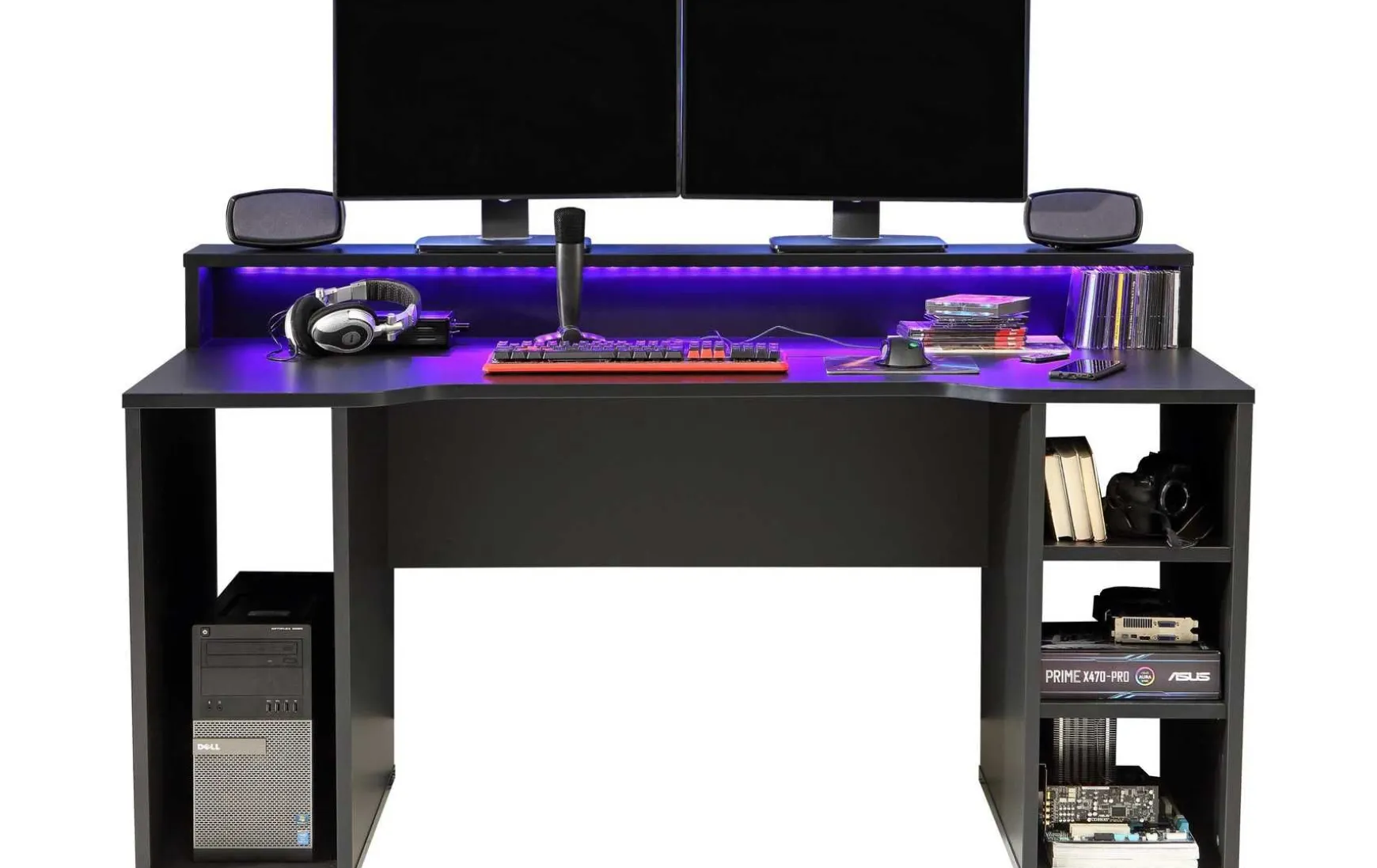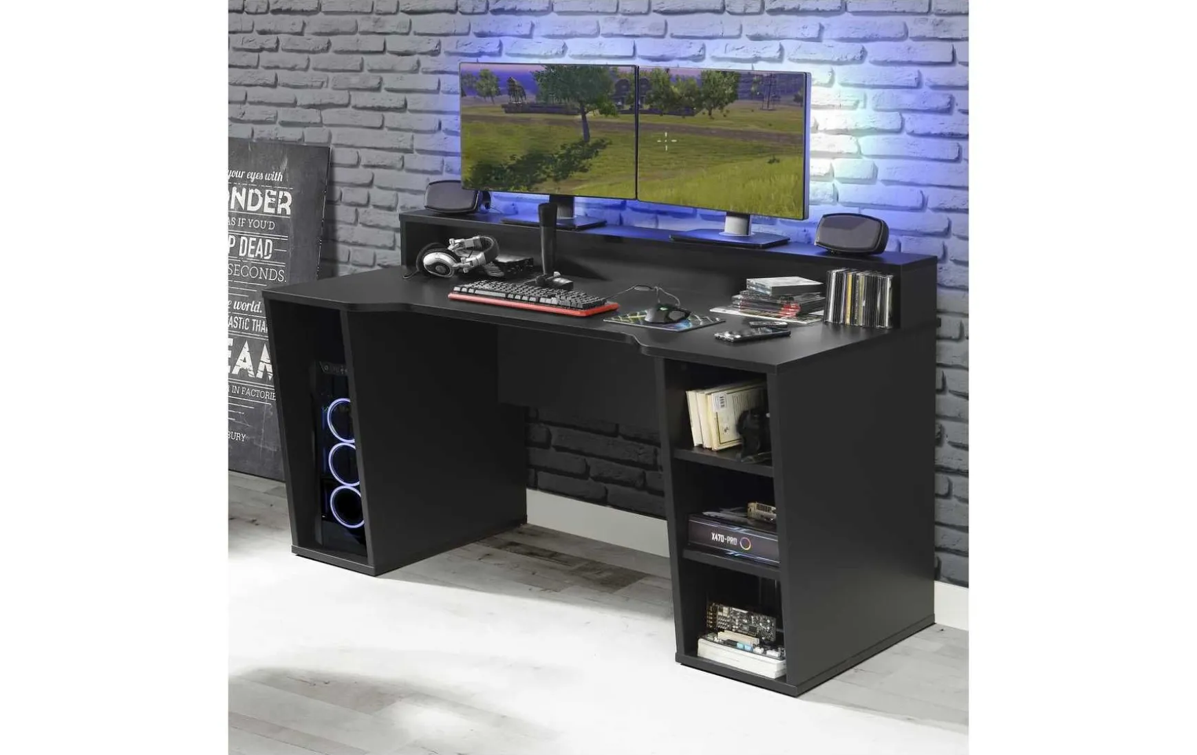 Mit den Maßen von ca. 160 × 72 × 91 cm (B/T/H) bietet der Tisch ausreichend Platz für Monitore, Laptops, Konsolen oder sonstige Multimedia-Geräte. Die Oberfläche ist pflegeleicht und trocken abwischbar, wodurch der Tisch besonders wartungsfreundlich ist. Optional kann gegen Mehrpreis eine RGB-LED-Beleuchtung ergänzt werden, um dem Arbeitsplatz oder Gaming-Setup zusätzliche Akzente zu verleihen.