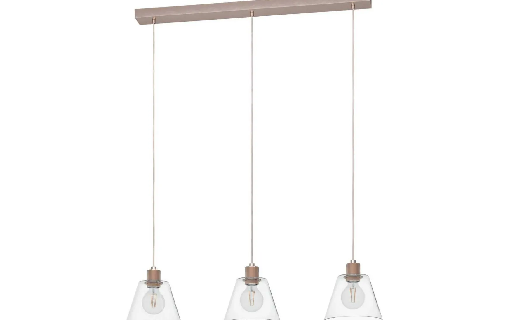 Diese Pendelleuchte ist mit drei konischen, klaren Glasschirmen gefertigt, die jeweils mit einer dekorativen Metallfassung in Roségold kombiniert wurden.