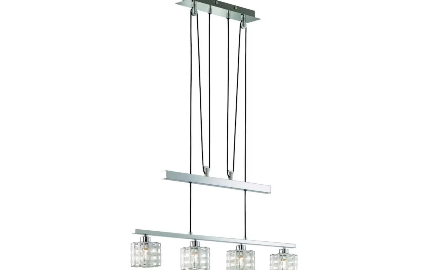 Die Hängehöhe lässt sich mittels Hebemechanismus auf maximal 184 cm verstellen. Enthält 4 x G9 28 W Halogenlampen, die jeweils eine Lichtleistung von 370 Lumen liefern, Farbtemperatur 2800 Kelvin. Die Kuppeln sind aus Metall und die Länge der Lampe beträgt 69,5 cm.