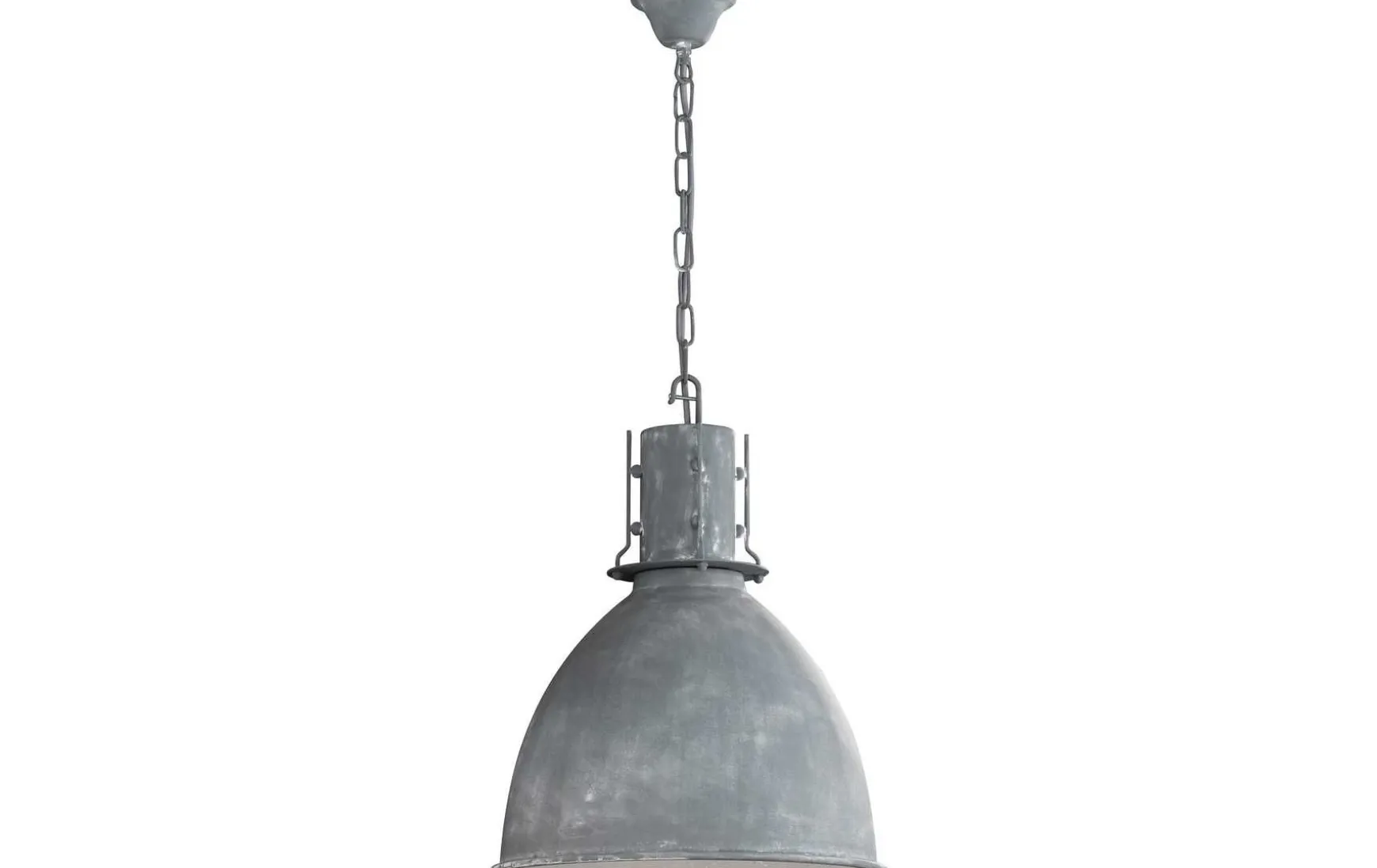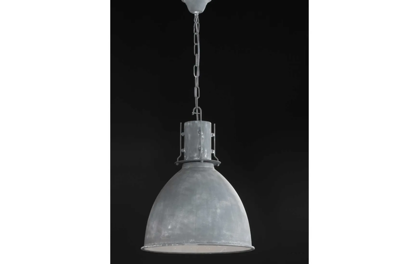 Diese Pendelleuchte ist aus beton farbigem Metall und passt in einen Industriellen Einrichtungsstil genauso gut wie in eine moderne Empfangshalle.Der Lampenschirm hat einen Durchmesser von 42 cm.