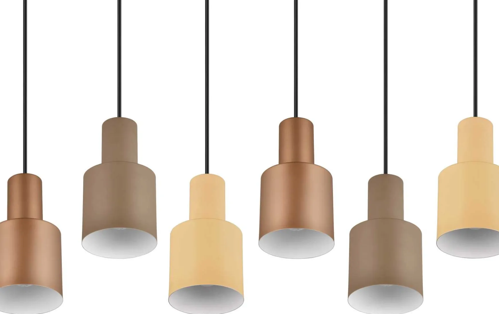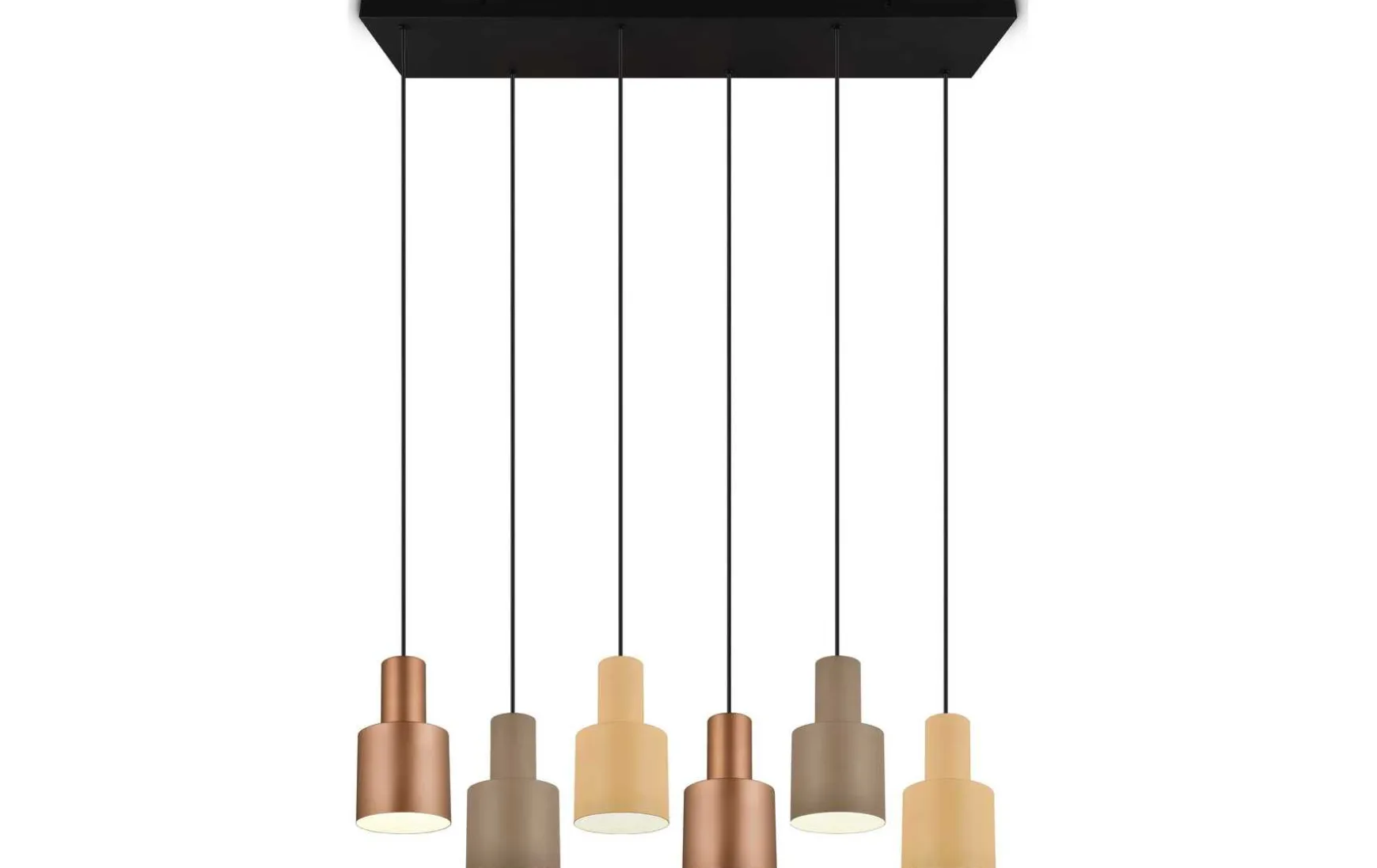 Leuchtschirme in unterschiedlichen Farbtönen und Höhen miteinander zu kombinieren, erzeugt Aufmerksamkeit und macht die Leuchte zu einem besonderen Gestaltungselement in Ihrem Zuhause. Die sechsflammige Pendelleuchte strahlt durch die natürliche Farbgebung und elegante Formsprache pure Gemütlichkeit und minimalistische Ästhetik aus. Über einem Ess- oder Wohnzimmertisch verbessert die Leuchte mit Ihrem warmen, natürlichen Erscheinungsbild das Raumklima. Die charakteristische Farbkombination aus gedeckten Naturfarben sowie Schwarz matt verleiht der Leuchte Stil. Das matte Metall-Finish der Leuchtschirme rundet die Leuchte perfekt zu einem eleganten Highlight ab. Für eine energiesparende Beleuchtung empfiehlt sich die Verwendung eines LED Leuchtmittels. Diese sind eine optimale Alternative zu herkömmlichen Halogen Leuchtmitteln und stehen für eine hohe Lichtqualität und eine Energieeinsparung von bis zu 80%. Zusätzlich profitieren Sie bei LED Leuchtmitteln von einer langen Lebensdauer, einer geringen Wärmeentwicklung und schonen gleichzeitig die Umwelt.