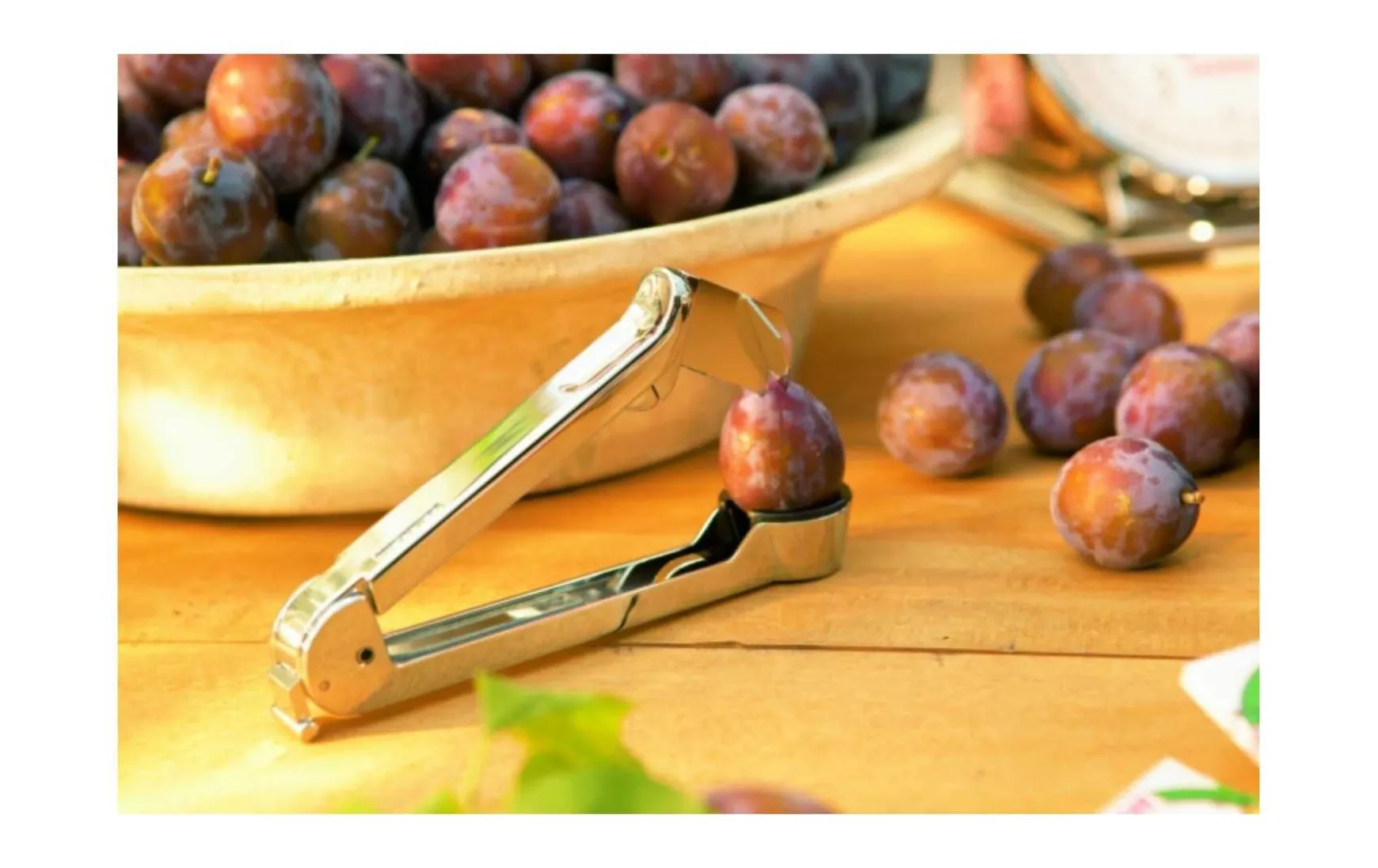 Die schnellste Art Pflaumen kuchengerecht zu entsteinen: Der Pflaumenentsteiner-Automat von Leifheit entkernt Pflaumen im Eiltempo. Mit seinem Edelstahlmesser entfernt der kleine Automat sauber die Steine und fächert das Fruchtfleisch kuchengerecht auf. Anschließend fällt das Fruchtfleisch in eine bereitgestellte Schüssel, während sich die Kerne in der Auffangschale sammeln. Der Pflaumenentsteiner steht rutschfest auf vier Gummifüßen. Sollen Mirabellen entkernt werden, braucht nur ein Stößel umgedreht zu werden. Nach getaner Arbeit ist das Gerät leicht zu reinigen, da es komplett unter fließendem Wasser abgespült werden kann.