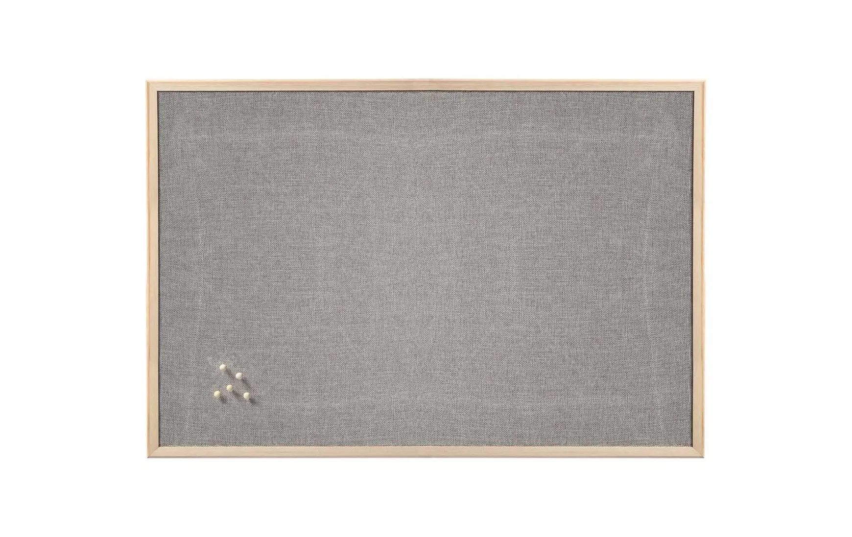 Schlicht, modern und stilvoll präsentiert sich dieses Pinboard. Es besteht aus vier hellen Kiefernholzleisten, die mit einem grauen Leinenstoff bespannt sind.&edsp;