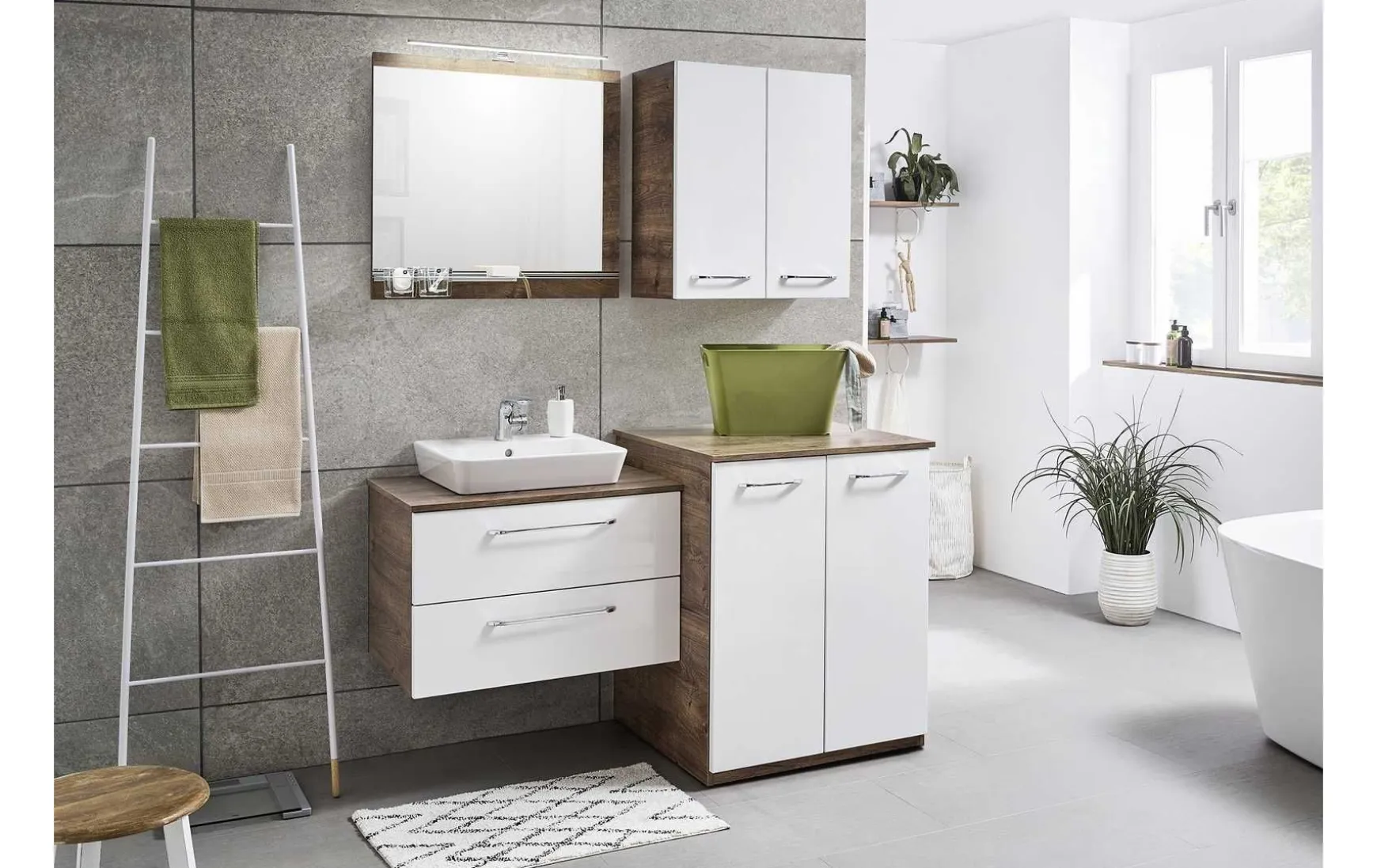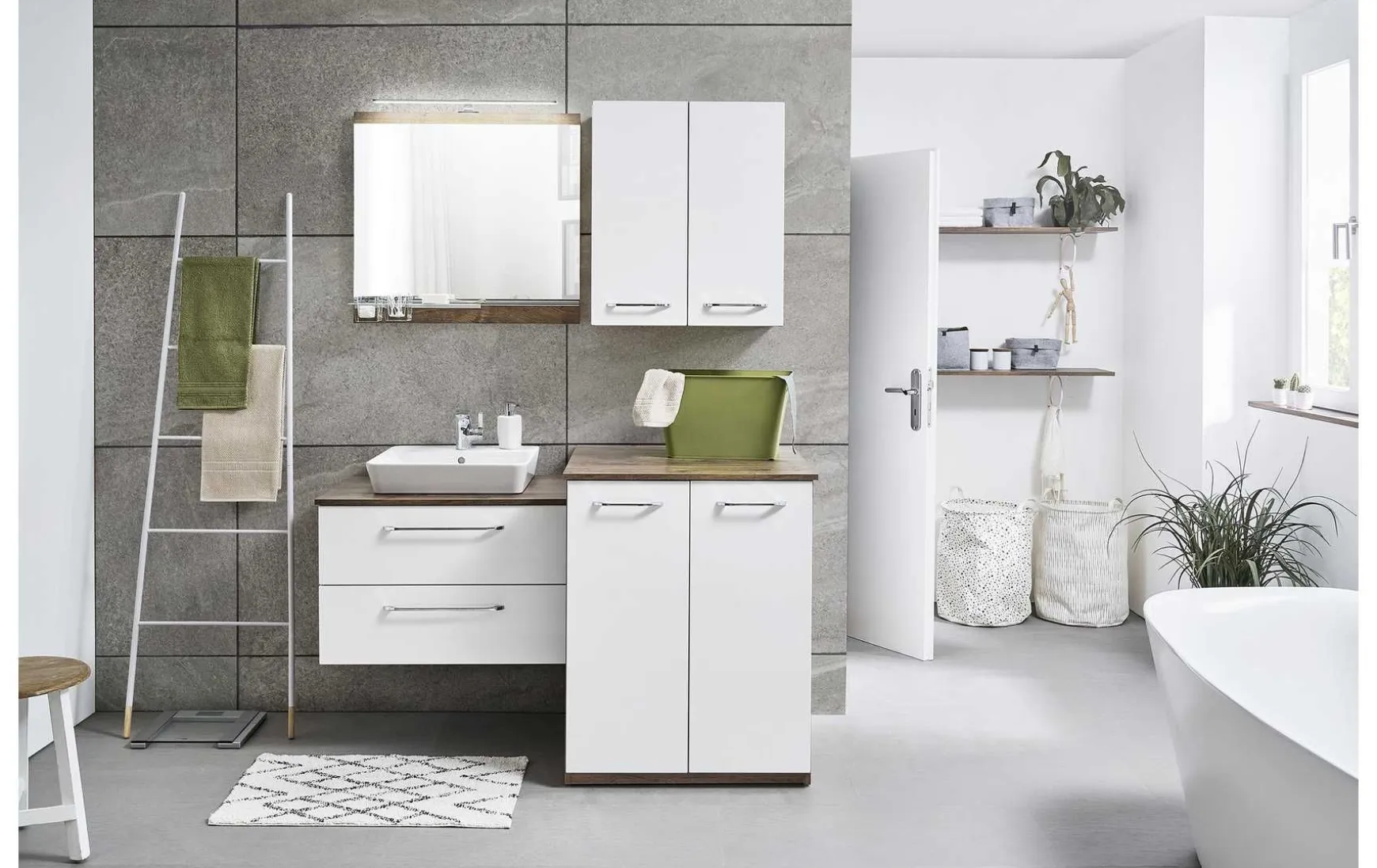 - Bestehend aus: 1x Funktionsspiegel, B/H/T: ca 75/70/3,5 cm; 1x Ablage für Funktionsspiegel inkl. 2 Glasbecher; 1x Aufsatzleuchte in Chrom Glanz, B/H/T: ca. 60/3/8 cm; 1x Keramik-Aufsatzbecken in Weiß Glanz mit Armaturbohrung und integriertem Überlauf, B/H/T: ca. 50/10/45 cm; 1x Einhebelmischer in Chrom Glanz; 1x Waschtischplatte unter dem Aufsatzbecken, B/H/T: ca. 76/1,8/50 cm; 1x Waschtischunterschrank mit Siphonausschnitt, 2 Auszüge, B/H/T: ca. 75/48,2/49 cm; 1x Waschmaschinenumbau mit 2 Türen, B/H/T: ca. 70,4/88,5/69 cm; 1x Waschtischplatte über dem Waschmaschinenumbau, B/H/T: ca. 73/1,8/69 cm; 1x Wandschrank mit 2 Drehtüren, 2 Glaseinlegeböden, B/H/T: ca. 60/70/33 cm