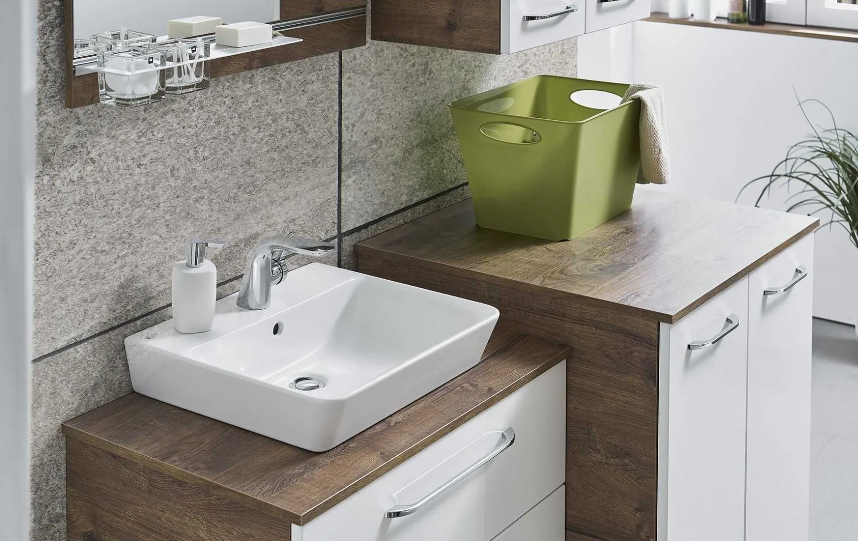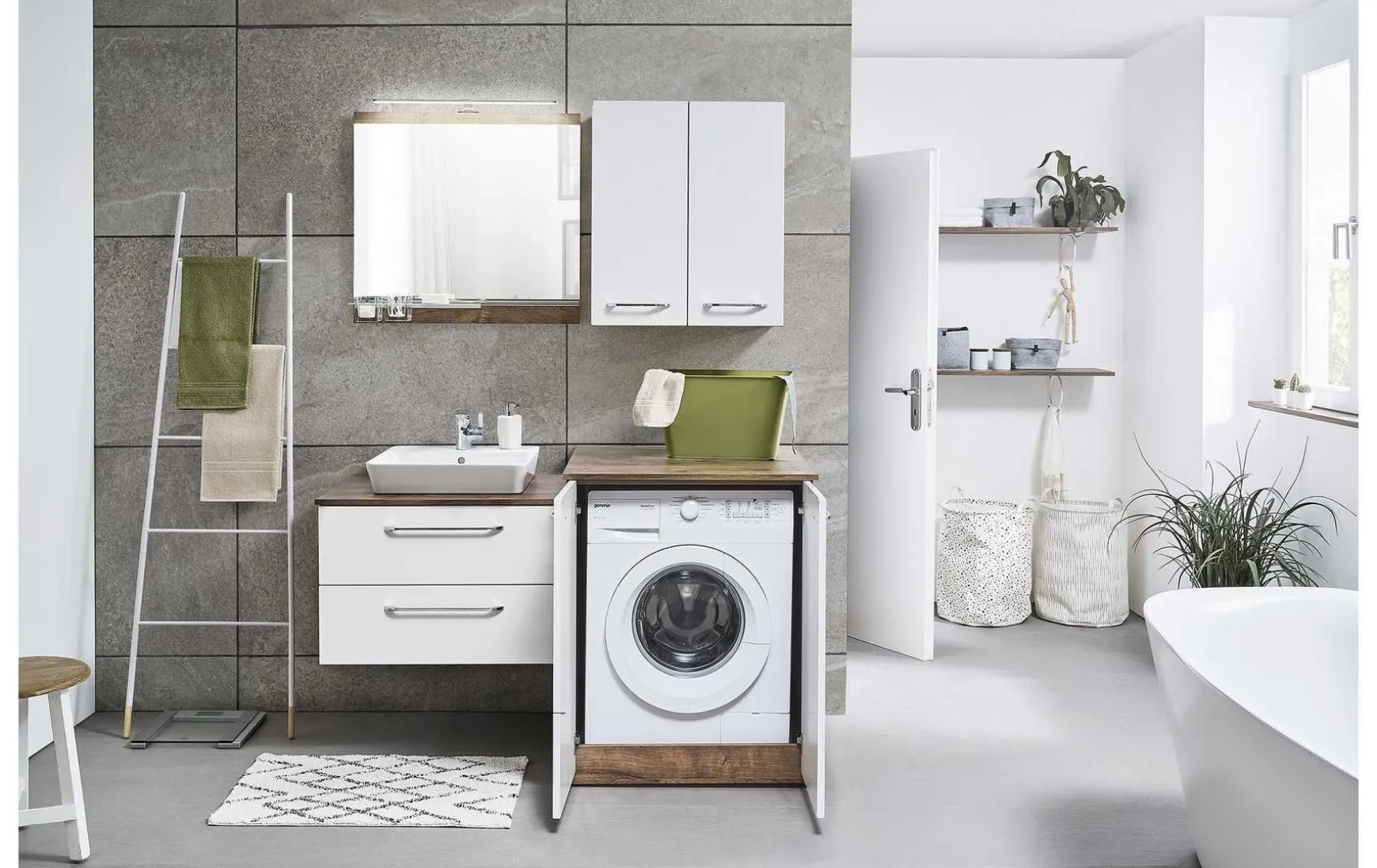 - Im Preis enthalten: 1x Funktionsspiegel, 1x Ablage für Funktionsspiegel inkl. 2 Glasbecher, 1x Aufsatzleuchte, 1x Keramik-Aufsatzbecken, 1x Waschtischplatte unter dem Aufsatzbecken, 1x Waschtischunterschrank, 1x Waschmaschinenumbau, 1x Waschtischplatte über dem Waschmaschinenumbau, 1x Wandschrank