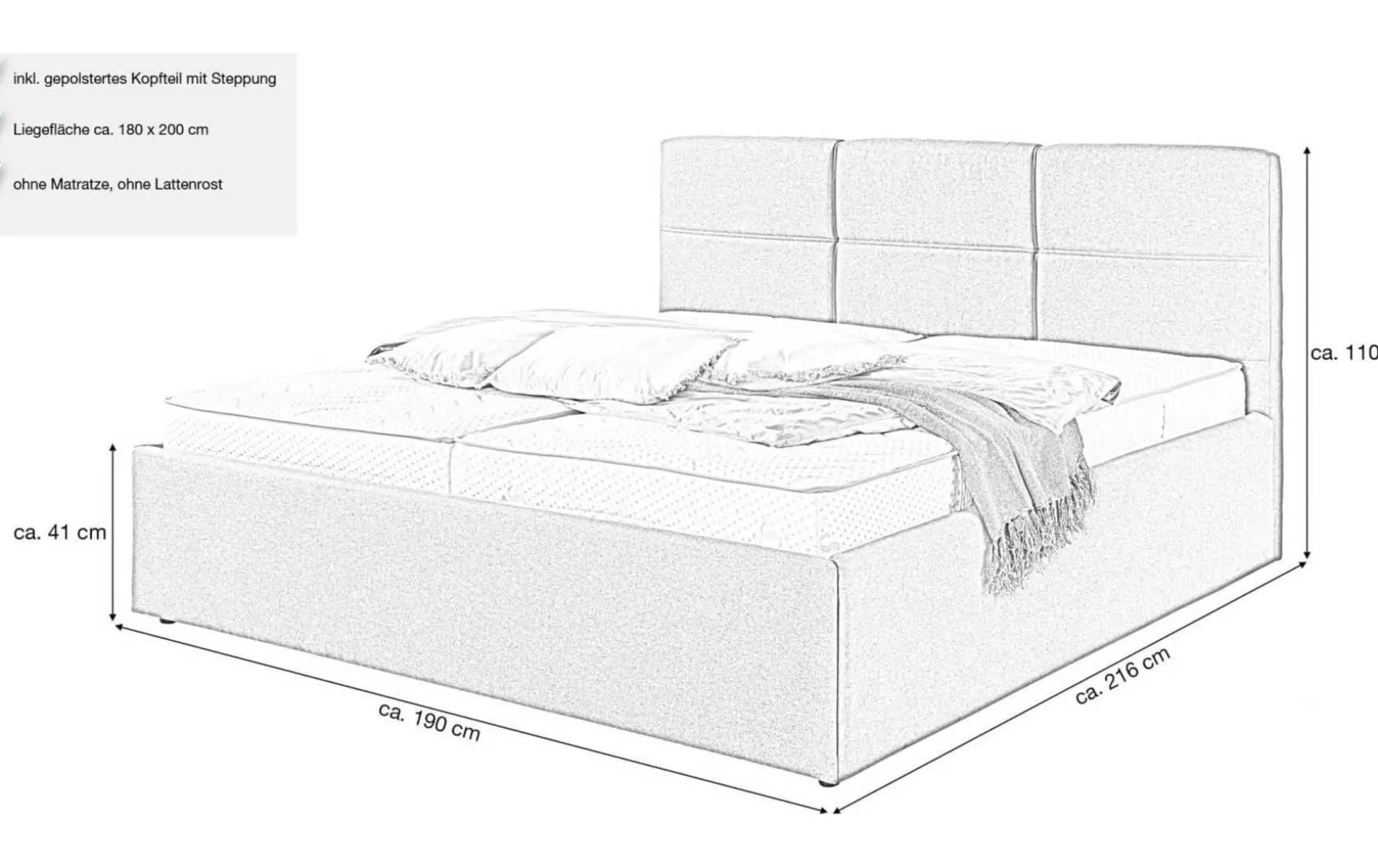 - Liegefläche: ca. 180 x 200 cm (Breite / Länge)