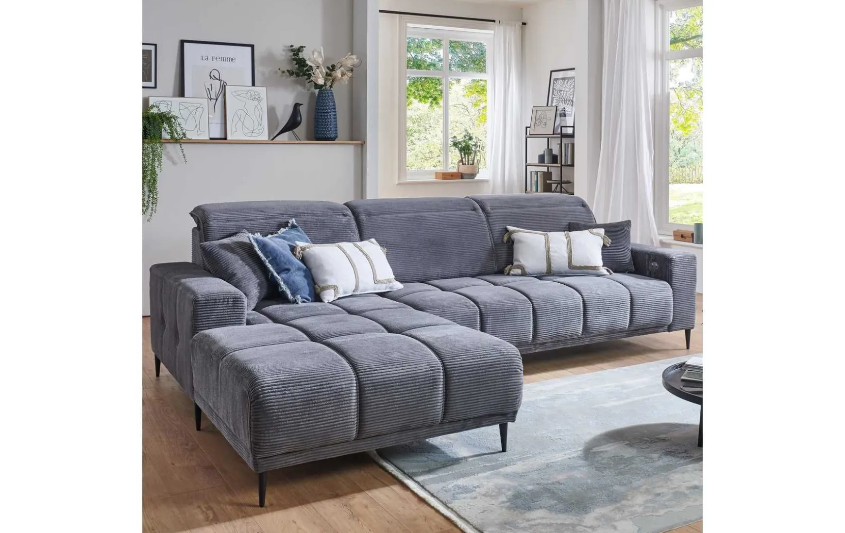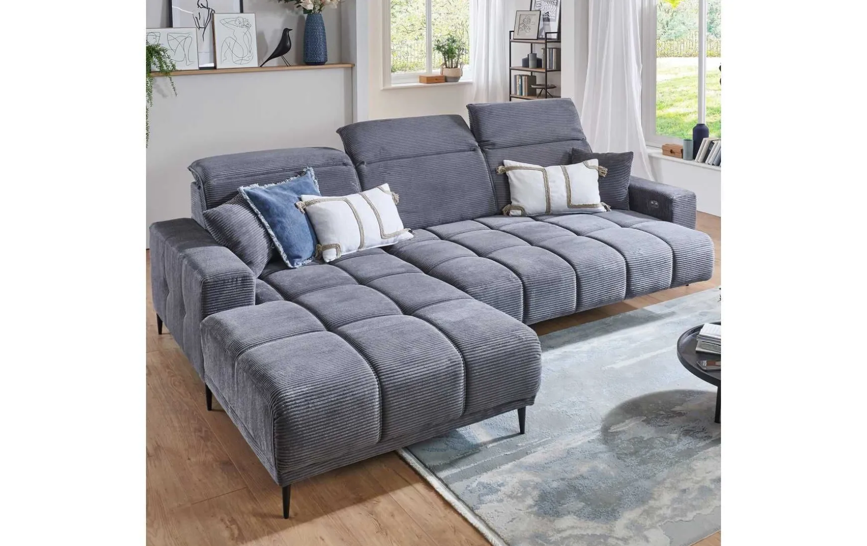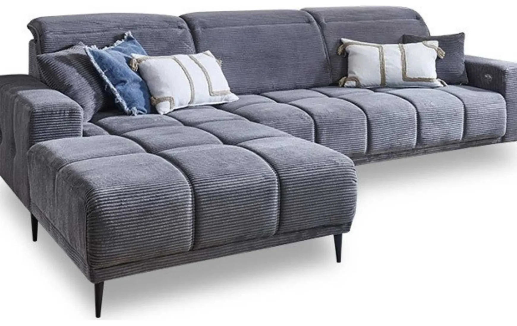 Diese moderne Polsterecke in angesagtem Cordgrau verbindet trendiges Design mit hohem Sitzkomfort. Der weiche Cordstoff verleiht dem Sofa eine wohnliche Optik, während die integrierte Kopfteilverstellung individuelles Entspannen ermöglicht. Dank der großzügigen Maße bietet die L-förmige Polsterecke viel Platz für Familie und Gäste. Die bequeme Polsterung mit Wellenunterfederung und Federkern sorgt für angenehmen Sitzkomfort, ergänzt durch stilvolle Zierkissen. Schwarze Metallfüße runden das moderne Gesamtbild harmonisch ab.