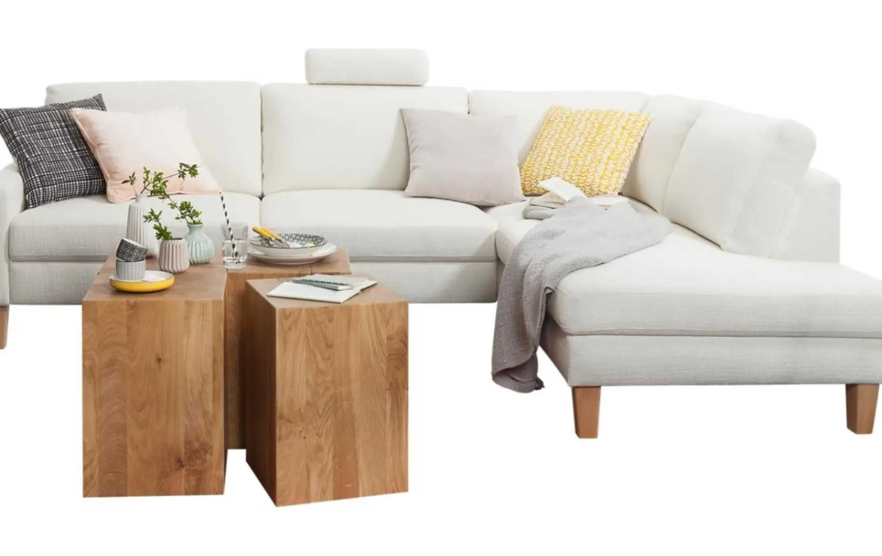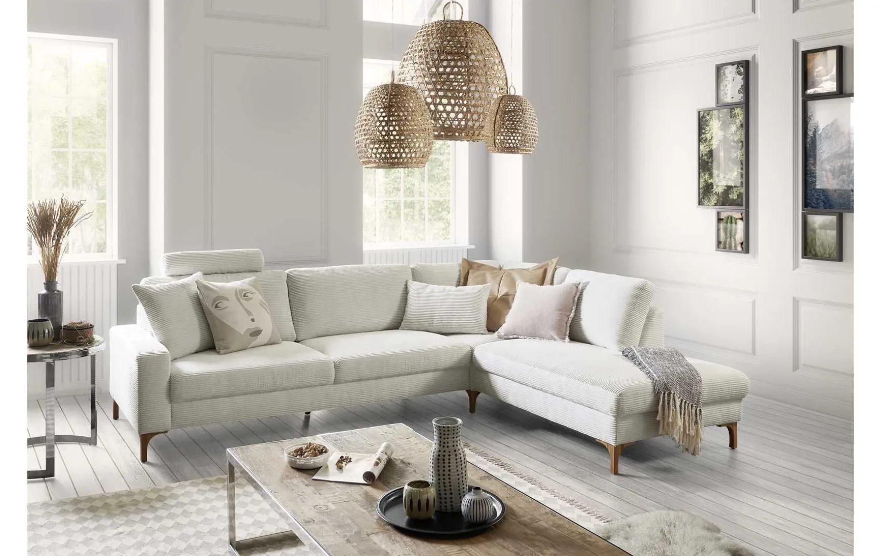 Diese stilvolle Polsterecke in trendigem Cord Snow vereint modernes Design mit hohem Sitzkomfort und praktischer Funktionalität. Die helle Farbgebung sorgt für eine freundliche, wohnliche Atmosphäre, während die geölten Eichefüße einen natürlichen Akzent setzen. Dank der großzügigen L-Form und der komfortablen Polsterung mit Tonnentaschenfederkern lädt das Sofa zum Entspannen ein. Zusätzlich bietet integrierter Stauraum eine clevere Lösung für Decken oder Kissen. Die Polsterecke ist individuell konfigurierbar und passt sich so optimal Ihren Wohnwünschen an.