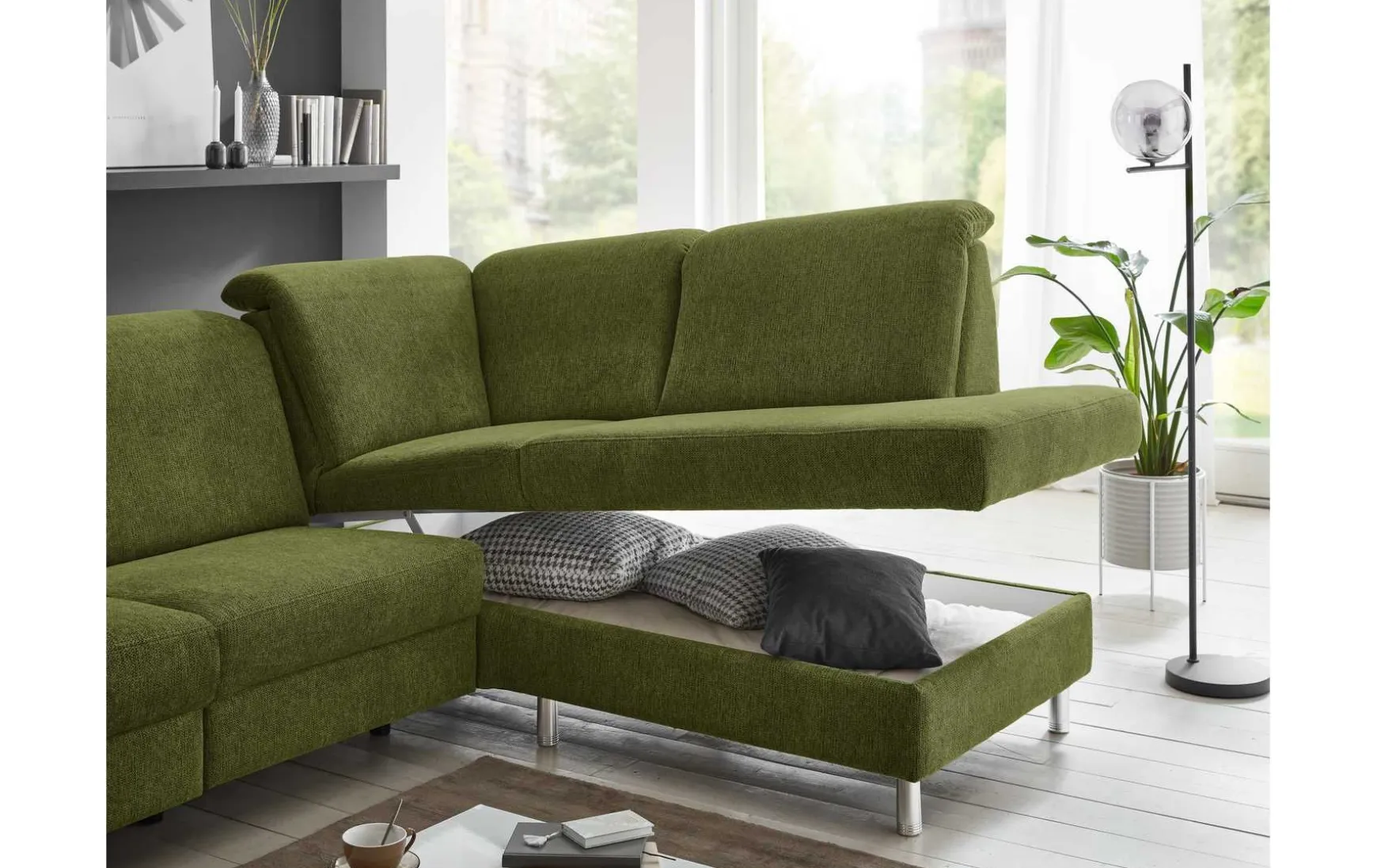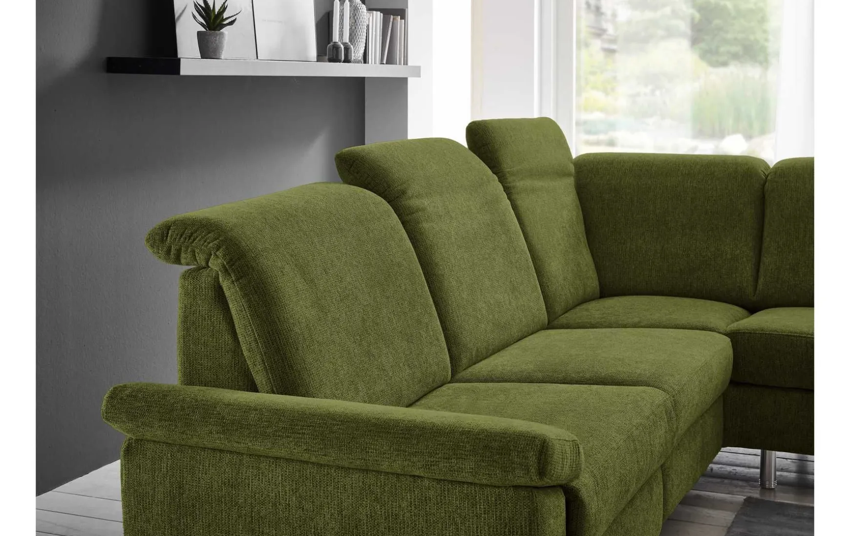 Diese moderne Polsterecke überzeugt mit tierfreundlichem WOW-Stoff in stilvollem Olivgrün und kombiniert Design, Komfort und innovative Funktionalität. Die motorische Vorziehbank ermöglicht auf Knopfdruck eine komfortable Relax- oder Liegeposition und macht das Sofa zum idealen Ort für entspannte Abende. Das Anbausofa auf der rechten Seite ist aufklappbar und bietet zusätzlichen Platz sowie praktischen Mehrwert.