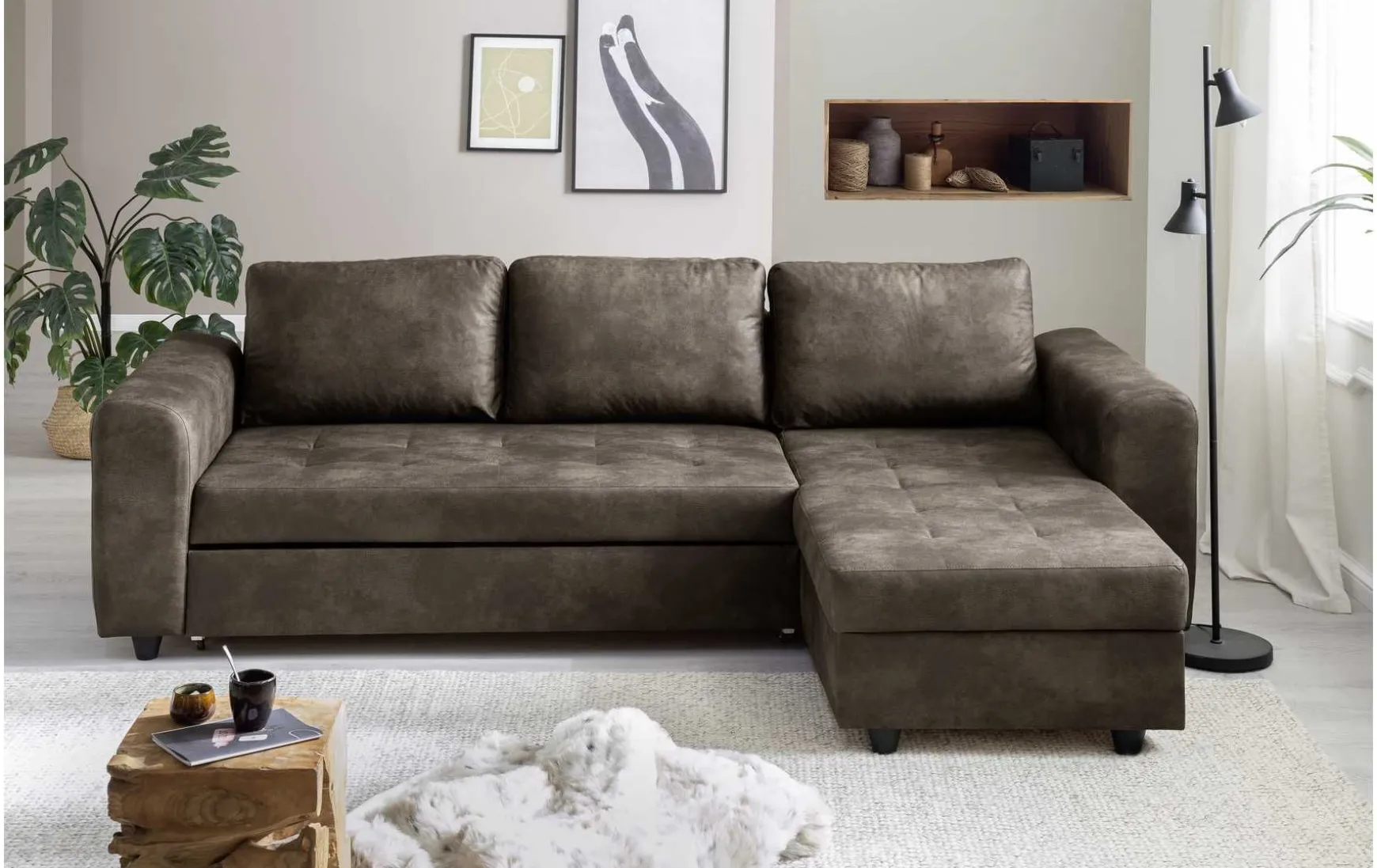 Unsere Polsterecke besteht aus einem dunkel braunen Microfaserbezug (100% Polyethylen), welcher nicht nur angenehm zur Haut ist, sondern auch wunderbar pflegeleicht. Die Antiklederoptik lädt Sie zu gemütlichen Stunden der Entspannung ein. Mit wenigen Handgriffen zaubern Sie ein komfortables Gästebett. Unter der Ottomane lassen sich Kissen und Bettwäsche sicher und staubfrei verstauen. Für einen angenehmen Sitz-und Liegekomfort sorgt der atmungsaktive Polyätherschaum auf Wellenunterfederung. Die Ottomane kann nach räumlichen Gegebenheiten wahlweise links oder rechts montiert werden. Unsere Funktionsecke lässt sich frei im Raum platzieren, dank dem echtbezogenen Rücken und ist in verschiedenen Wohnstilen integrierbar.