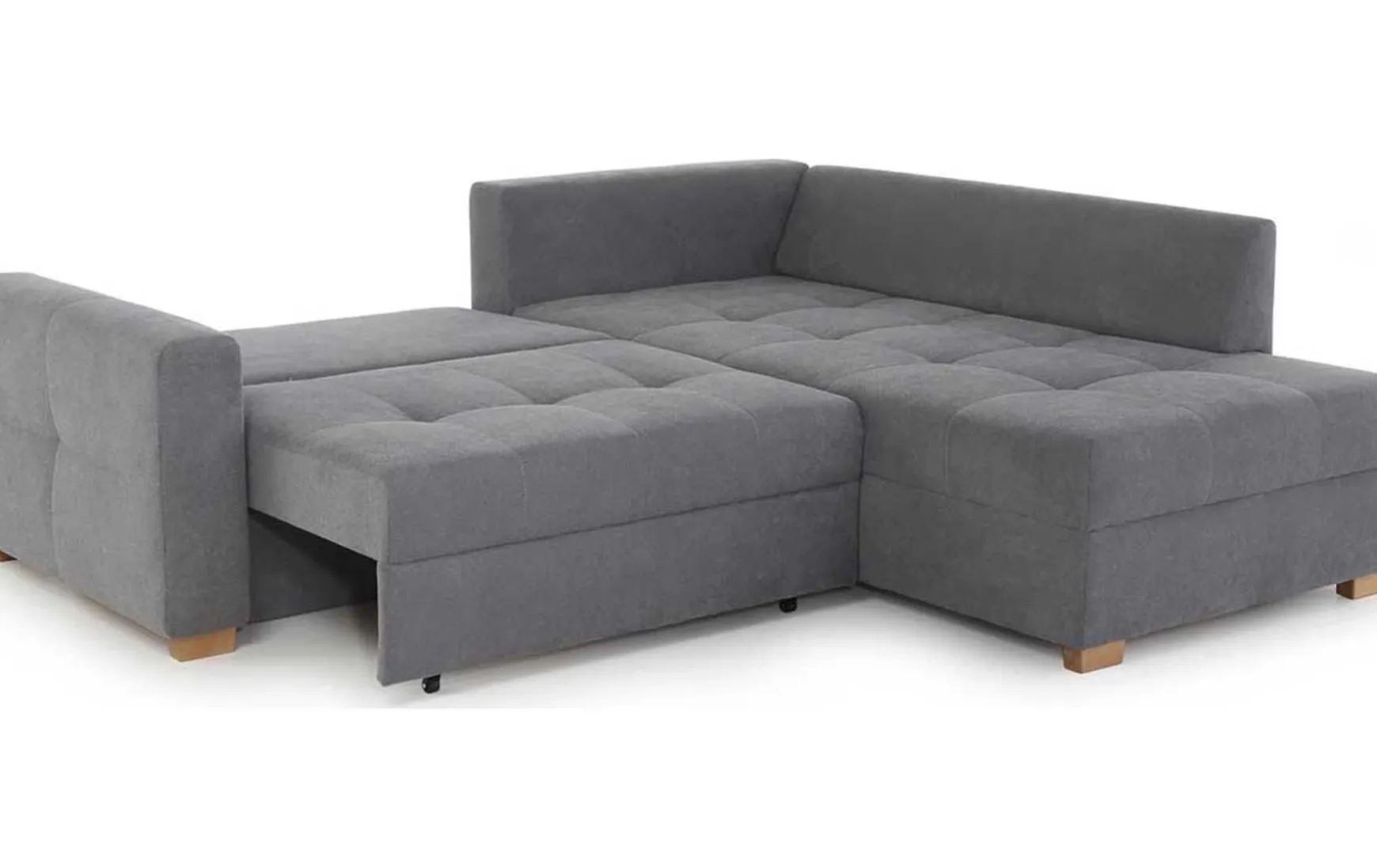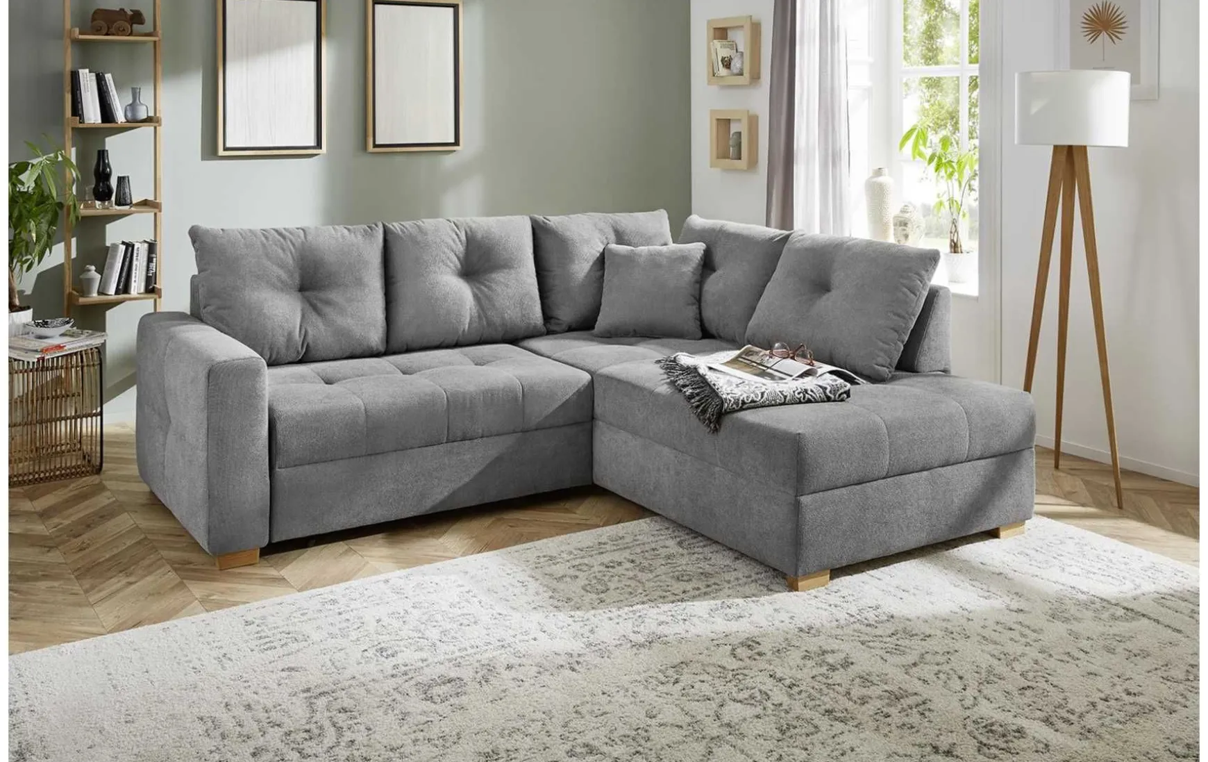 Praktische Wohnlandschaft mit Gästebettfunktion mit attraktiven Steppungen und Ziernähten im Sitz. Der integrierte Bettkasten bietet ausreichend Stauraum. Die Polyätherschaumpolsterung sorgt für einen guten Sitz- und Liegecomfort.