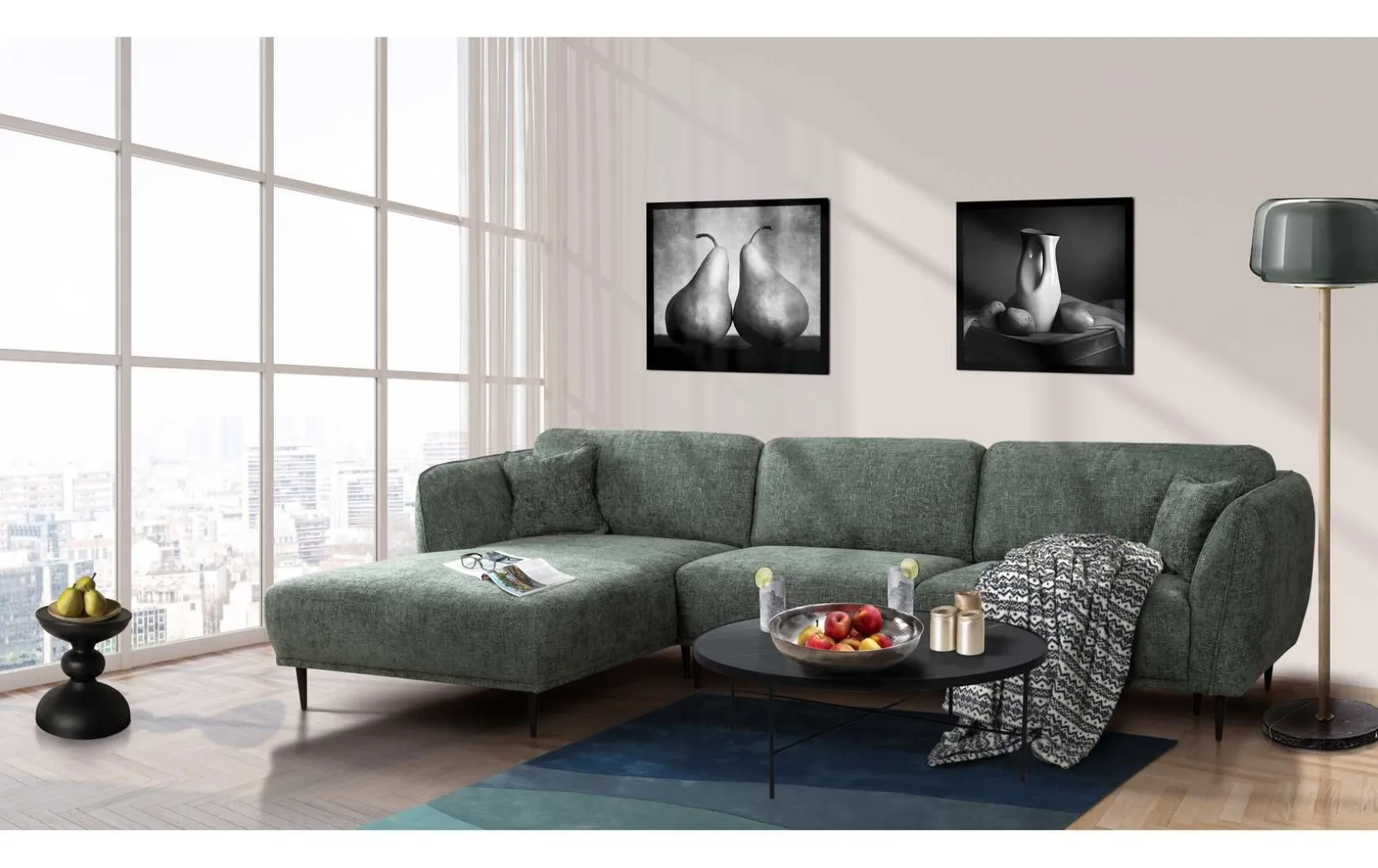 Modernes Sofa mit hohen Füßen – das Ecksofa überzeugt mit einem schicken Design. Eine rundliche Form mit gut gepolsterten Rückenlehnen in Kissen-Optik und zwei Zierkissen sorgt für einen sehr gemütlichen Look. An den Armlehnen befindet sich eine dekorative Kedernaht. die hohen Metallfüße sind optisch sehr ansprechend und bieten genug Freiraum unter dem Sofa. Die Polsterecke ist ein eleganter Blickfang, der Ihnen einen hohen Sitzkomfort bietet.