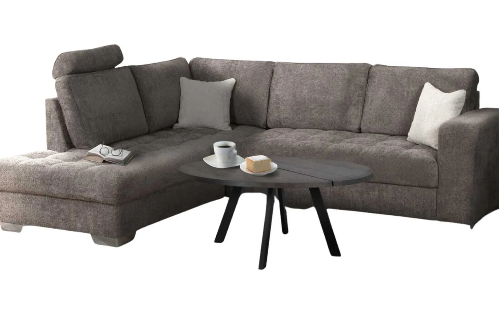 Moderne Polsterecke in L-Form mit echt bezogenem Rücken und hellem Stoffbezug in Hellgrau. Optional mit Bettfunktion, Relaxfunktion oder Kopfstütze (gegen Mehrpreis) bestellbar. Maße: ca. 267 × 215 cm (L/B). In weiteren Farben und Zusammenstellungen erhältlich – flexibel an Ihre Wünsche anpassbar.