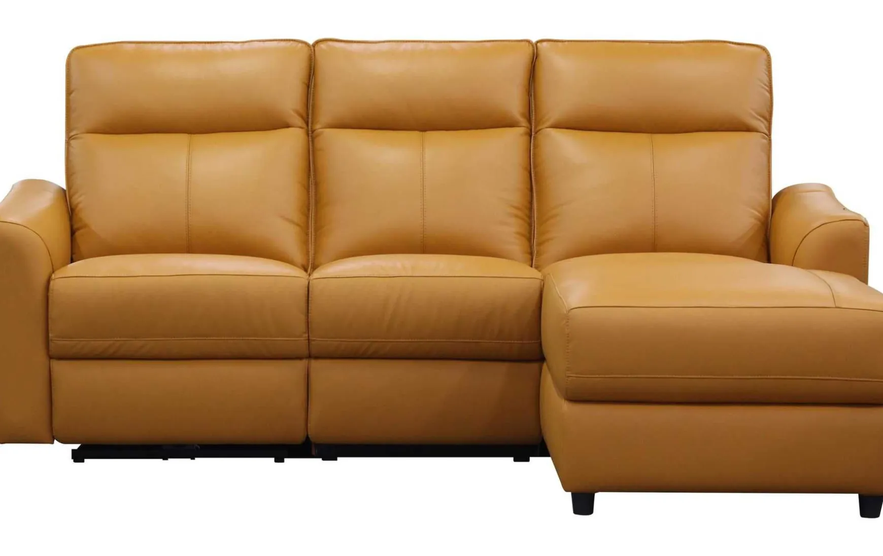 Diese kompakte Polsterecke im Konsum-Stil überzeugt durch modernes Design und hohen Komfort. Der hochwertige Lederbezug in trendigem Curry-Gelb setzt einen ausdrucksstarken Akzent im Wohnraum. Dank der integrierten elektrischen Relaxfunktion, die bereits im Preis enthalten ist, lässt sich die Sitzposition bequem anpassen. Mit Schenkelmaßen von ca. 217 cm links und ca. 158 cm rechts, einer Sitzhöhe von ca. 48 cm sowie einer Sitztiefe von ca. 50 cm eignet sich die L-förmige Polsterecke ideal für gemütliche und zugleich platzsparende Wohnlösungen.