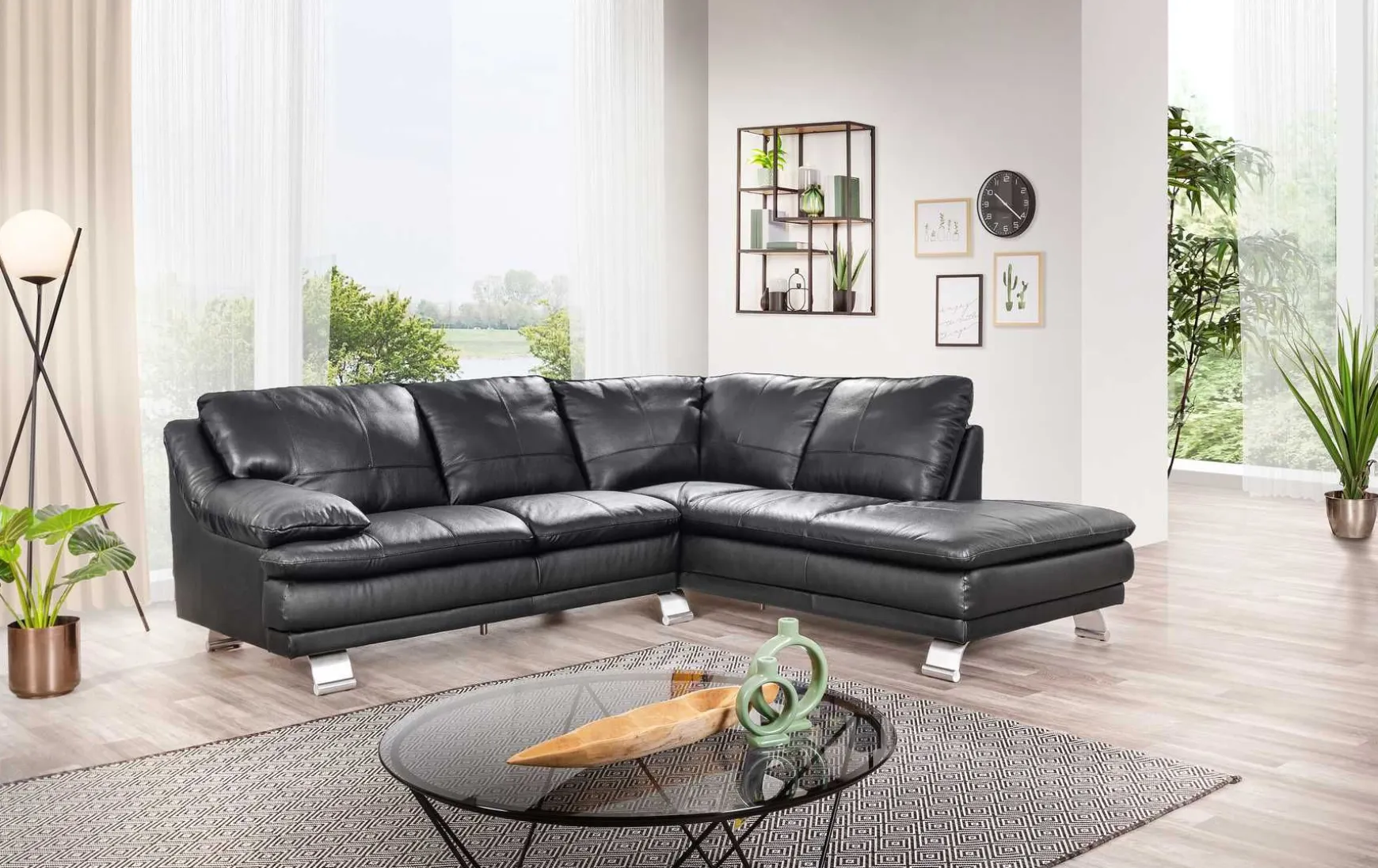 Diese moderne Polsterecke aus hochwertigem Spaltleder in elegantem Schwarz vereint zeitloses Design mit hohem Sitzkomfort. Mit ihren großzügigen Maßen von ca. 220 × 246 cm bietet sie viel Platz zum Entspannen und macht in jedem Wohnzimmer eine stilvolle Figur. Das Eckelement mit offenem Abschluss auf der linken Seite sorgt für eine einladende, moderne Optik, während die Armlehne auf der rechten Seite zusätzlichen Komfort bietet. Die chromfarbenen Metallfüße setzen einen edlen Akzent und unterstreichen den modernen Charakter der Polsterecke. Dank des echt bezogenen Rückens kann das Sofa auch frei im Raum platziert werden. Ob für gemütliche Abende, entspannte Stunden oder als stilvolles Highlight im Wohnbereich – diese Polsterecke überzeugt durch Qualität, Design und Alltagstauglichkeit.