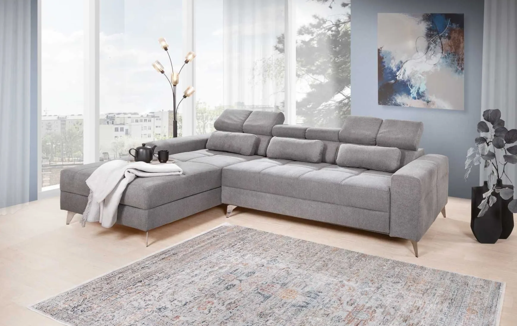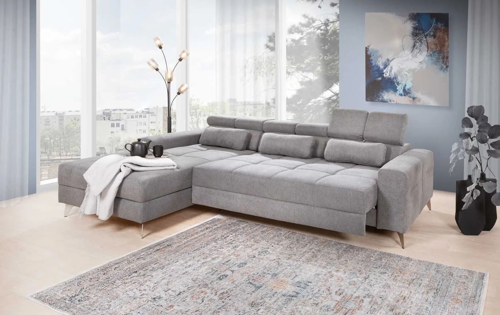 Das hochwertige Sofa „Fenix“ in elegantem Grauton bietet modernen Wohnkomfort auf hohem Niveau und überzeugt durch Design, Funktion und Qualität. Mit seinem großzügigen Stellmaß von ca. 200 × 290 cm wird es schnell zum Mittelpunkt des Wohnzimmers. Der motorische Sitzvorzug erweitert die Sitztiefe stufenlos von ca. 73 bis 103 cm – ideal zum entspannten Liegen, Lesen oder für Filmabende. Daraus entsteht eine komfortable Liegefläche von ca. 103 × 240 cm – eine echte Relaxzone.