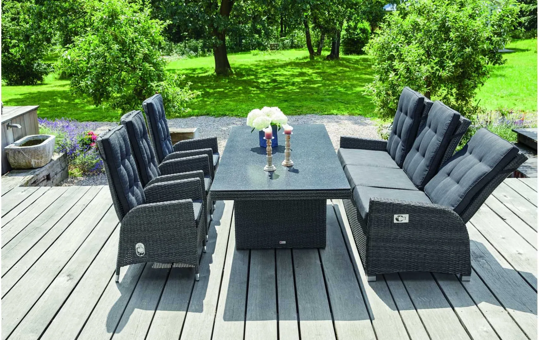 - Pflegehinweise: Schützen Sie Ihre Gartenmöbel vor Feuchtigkeit, Verschmutzung, Regen, Staub und Schnee.