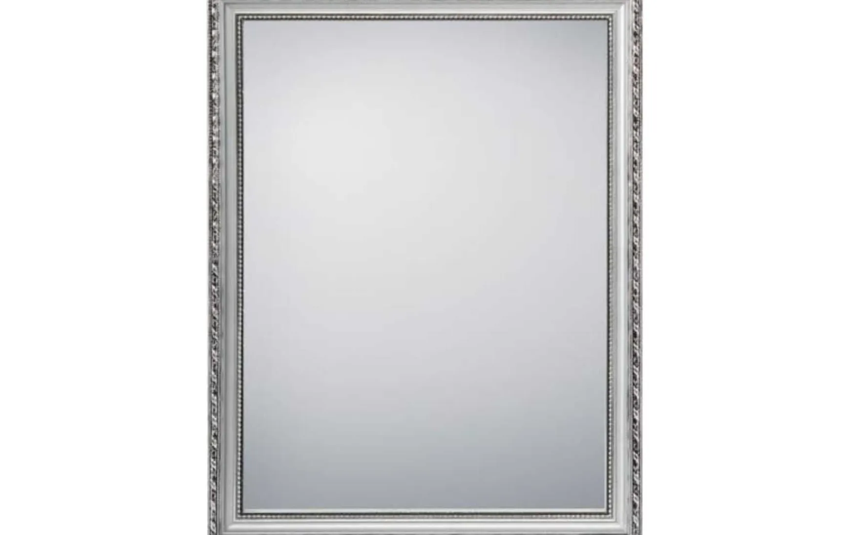 Dieser Spiegel hat eine Größe von 34 x 45 cm und ist mit einem eleganten titanfarbigen Rahmen ausgestattet.