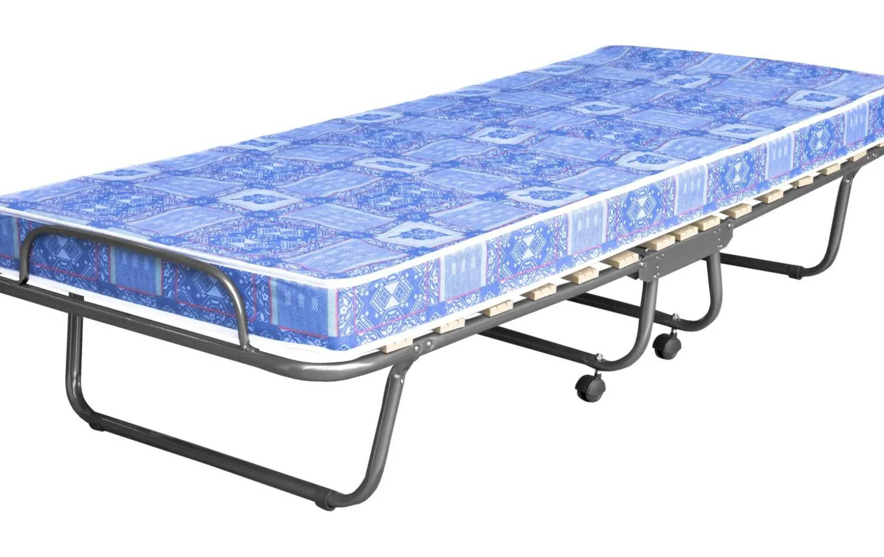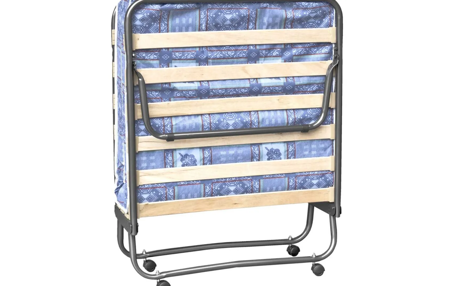Dieses Metallbett ist klappbar und somit ein absolutes Raumsparbett mit integriertem Lattenrost und Schaummatratze. Robustes Gestell. Lattenrost mit 17 Holzleisten. 10 cm hohe Schaummatratze mit einem Raumgewicht von 24/m³. Matratzenbezug aus 100 % Polyester mit Brandschutz Ausrüstung. Schnelle und einfache Handhabung, Bett klappbar und platzsparend zu verstauen. Leicht zu transportieren: im zusammengeklappten Zustand kann das Bett auf Räder gerollt werden.