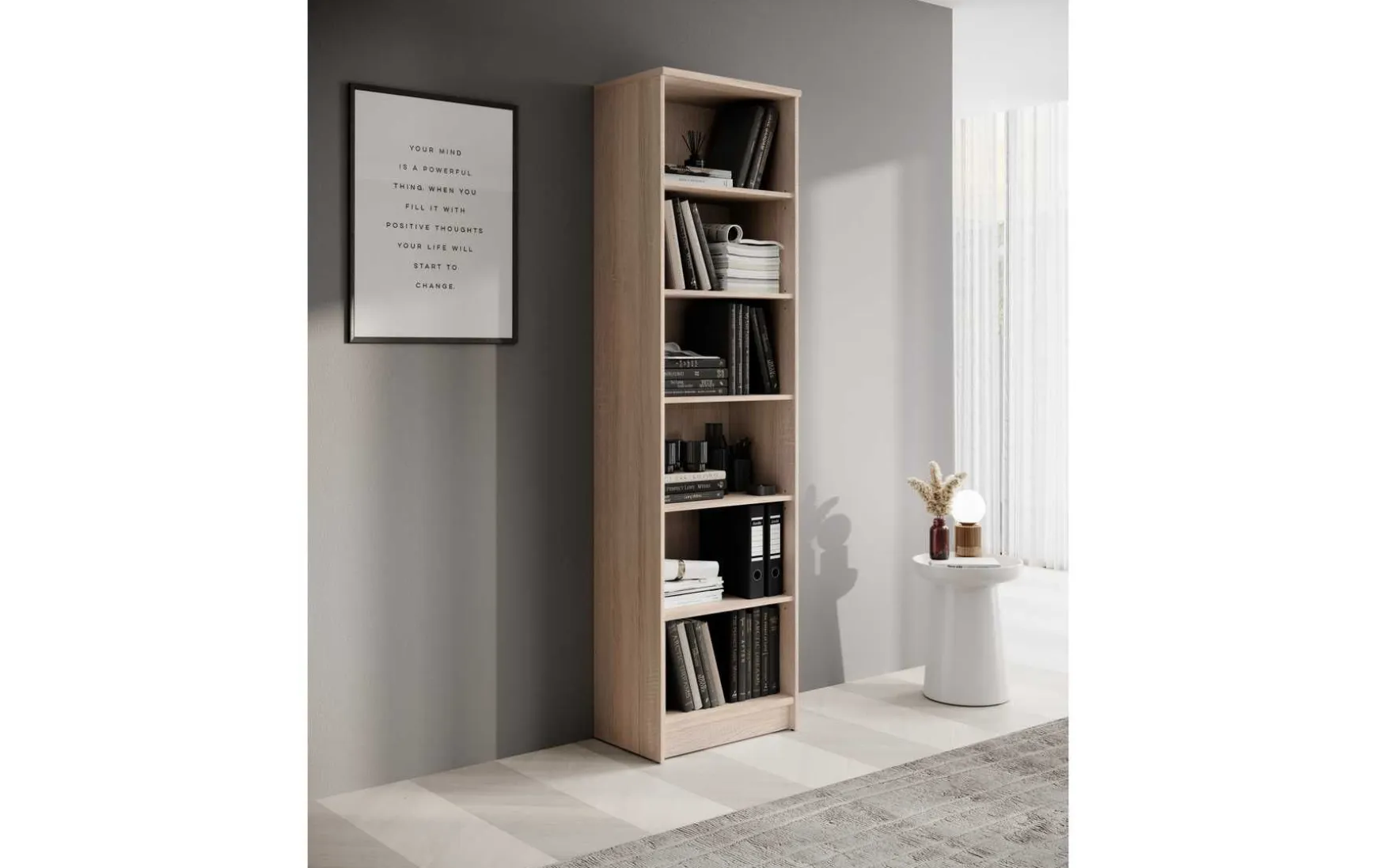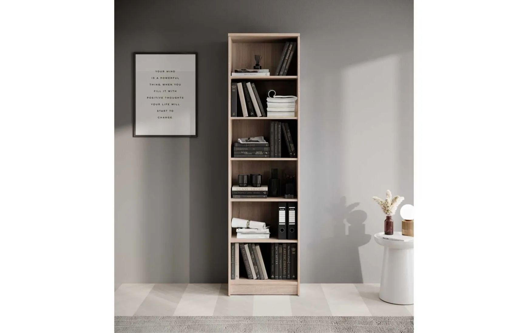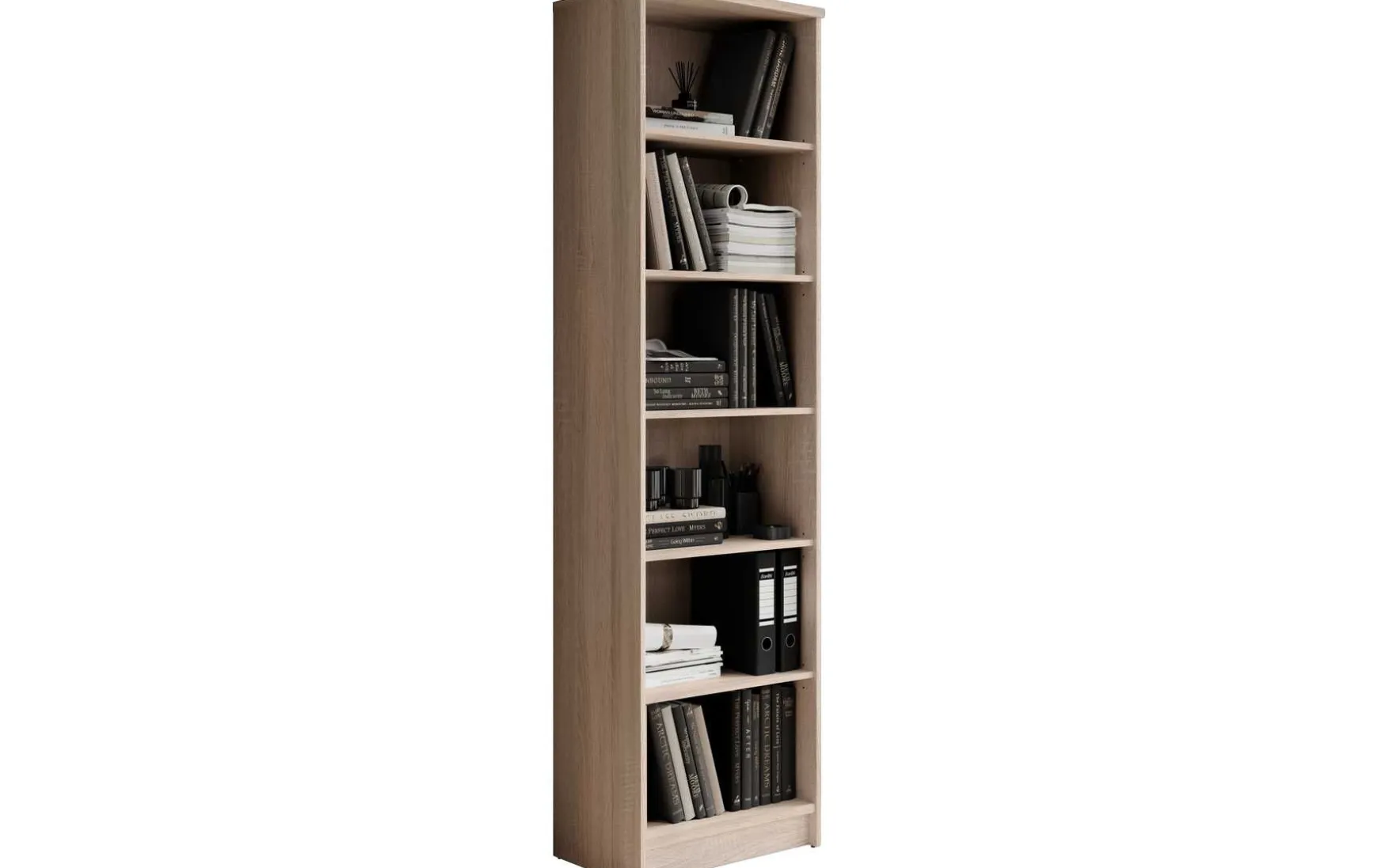 Das Regal kann in jedem Raum praktisch genutzt werden. Es verfügt über sechs geräumige Fächer, die sich für Bücher oder auch Geschirr und viele andere Sachen anbieten. Die Einlegeböden können Sie in der Höhe verstellen. Das Regal ist in einer zeitlosen Holzoptik designt.