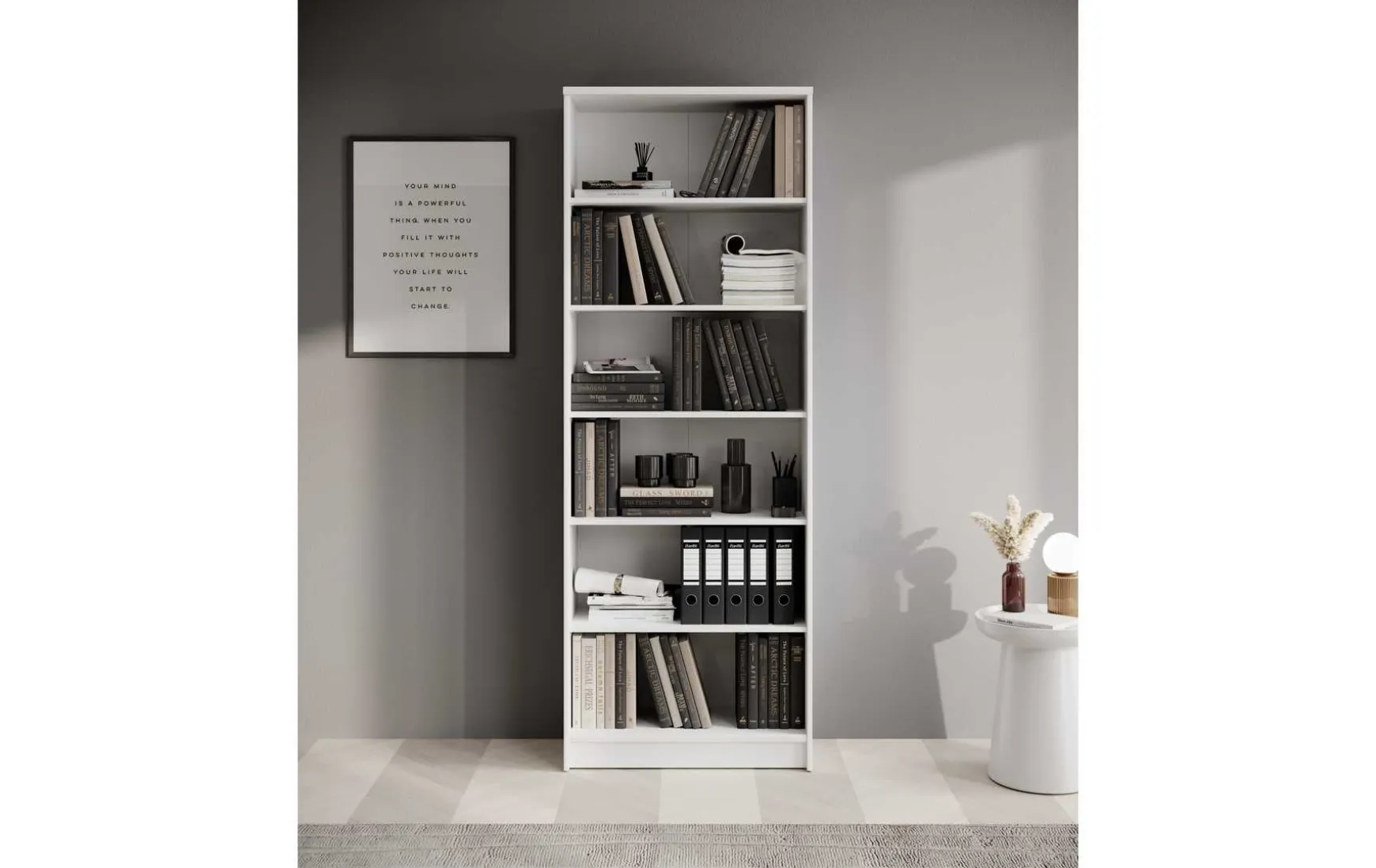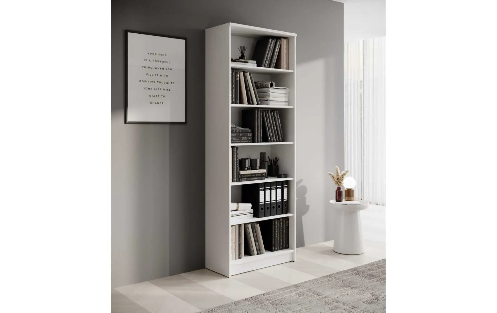 Das Regal in Weiß Dekor besticht durch sein zeitloses und modernes Design und passt ideal in Wohnzimmer, Büro oder Schlafzimmer. Der Korpus aus melaminbeschichtetem Holzwerkstoff sorgt für eine pflegeleichte, robuste Oberfläche, während die schwarzen Kunststofffüße einen eleganten Akzent setzen. Mit 6 offenen Fächern bietet das Regal viel Stauraum für Bücher, Ordner oder Dekoration und nutzt die Höhe des Raumes optimal aus. Mit den Maßen von ca. 72 × 198 × 34 cm (B/H/T) ist es geräumig, dabei aber schlank und platzsparend. Zur Pflege genügt ein trockenes Staubtuch, auf scheuernde oder lösungsmittelhaltige Reinigungsmittel sollte verzichtet werden. Das Regal wird zerlegt geliefert, Dekoration ist nicht enthalten.