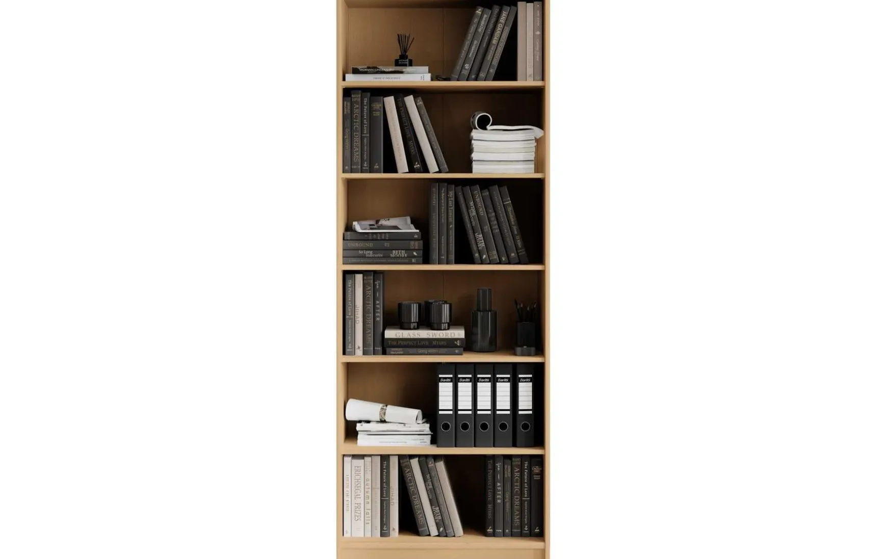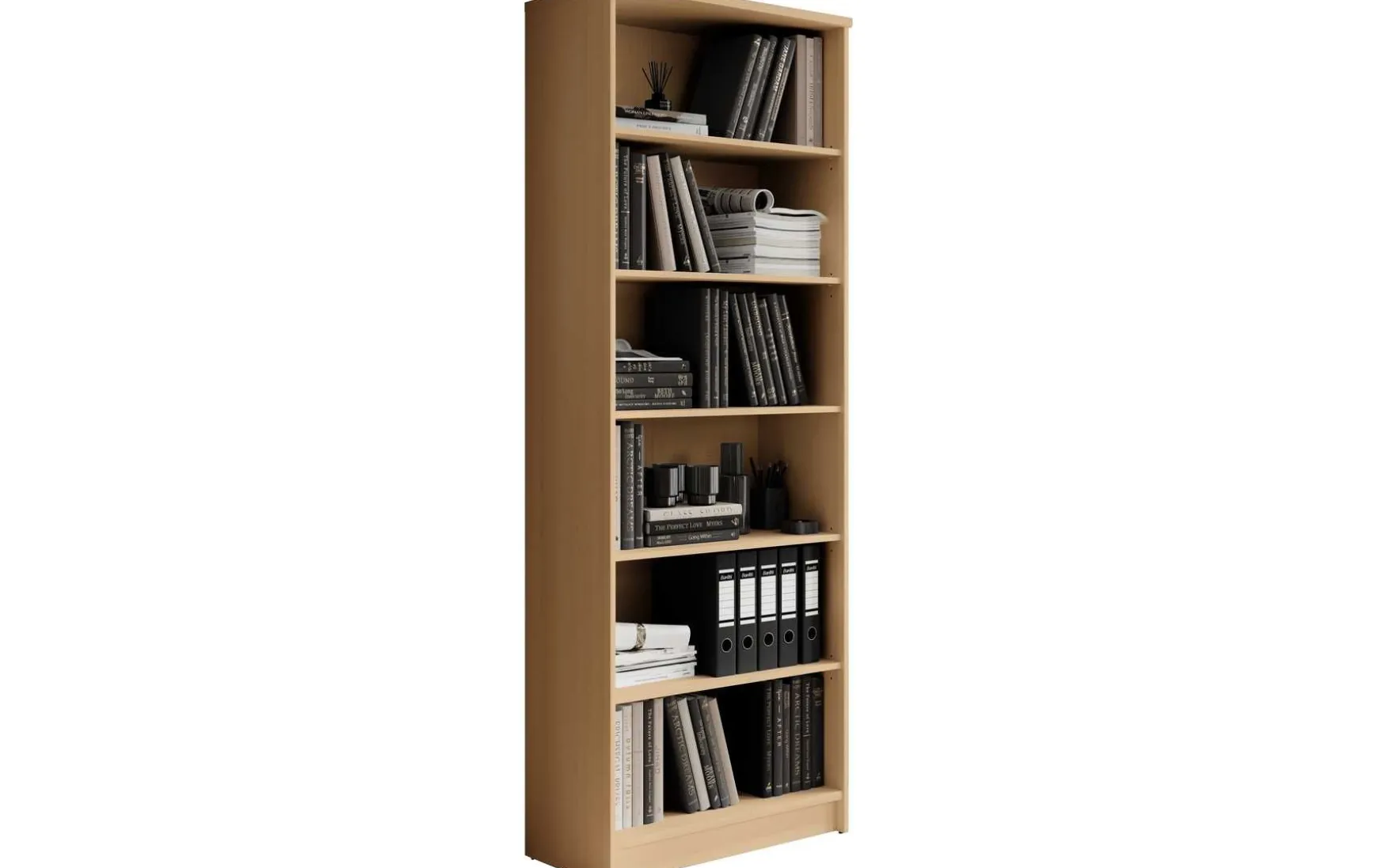 Das Regal in Buche Dekor besticht durch sein zeitloses und modernes Design und ist ideal für Wohnzimmer, Büro oder Schlafzimmer. Der Korpus aus melaminbeschichtetem Holzwerkstoff sorgt für eine pflegeleichte und langlebige Oberfläche, während die schwarzen Kunststofffüße einen stilvollen Akzent setzen. Mit 6 offenen Fächern bietet das Regal großzügigen Stauraum für Bücher, Ordner oder Dekoration und nutzt die Höhe des Raumes optimal aus. Die Maße von ca. 72 × 198 × 34 cm (B/H/T) machen es geräumig, gleichzeitig schlank und platzsparend. Zur Reinigung genügt ein trockenes Staubtuch, auf scheuernde oder lösungsmittelhaltige Reinigungsmittel sollte verzichtet werden. Das Regal wird zerlegt geliefert, Dekoration ist nicht im Preis enthalten.