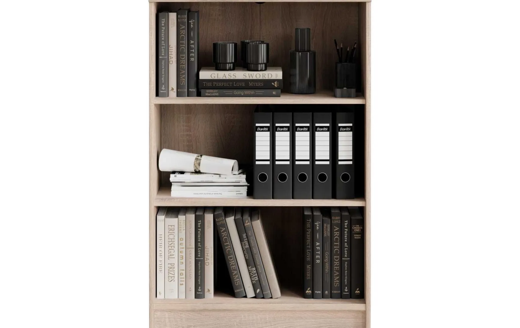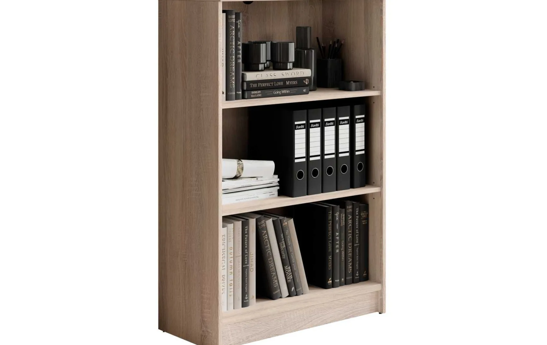 Das Regal im Eiche Sonoma Dekor überzeugt durch sein zeitloses und modernes Design und passt ideal in Wohnzimmer, Büro oder Schlafzimmer. Der Korpus aus melaminbeschichtetem Holzwerkstoff sorgt für eine pflegeleichte und langlebige Oberfläche. Mit 3 offenen Fächern bietet das Regal praktischen Stauraum für Bücher, Ordner oder Dekoration. Dank seiner Maße von ca. 72 × 111 × 34 cm (B/H/T) bietet es viel Platz, ohne zu viel Raum einzunehmen. Die schwarzen Kunststofffüße setzen einen modernen Akzent und sorgen für einen stabilen Stand. Zur Pflege genügt ein trockenes Staubtuch, auf lösungsmittelhaltige oder scheuernde Reinigungsmittel sollte verzichtet werden. Das Regal wird zerlegt geliefert, Dekoration ist nicht im Preis enthalten.