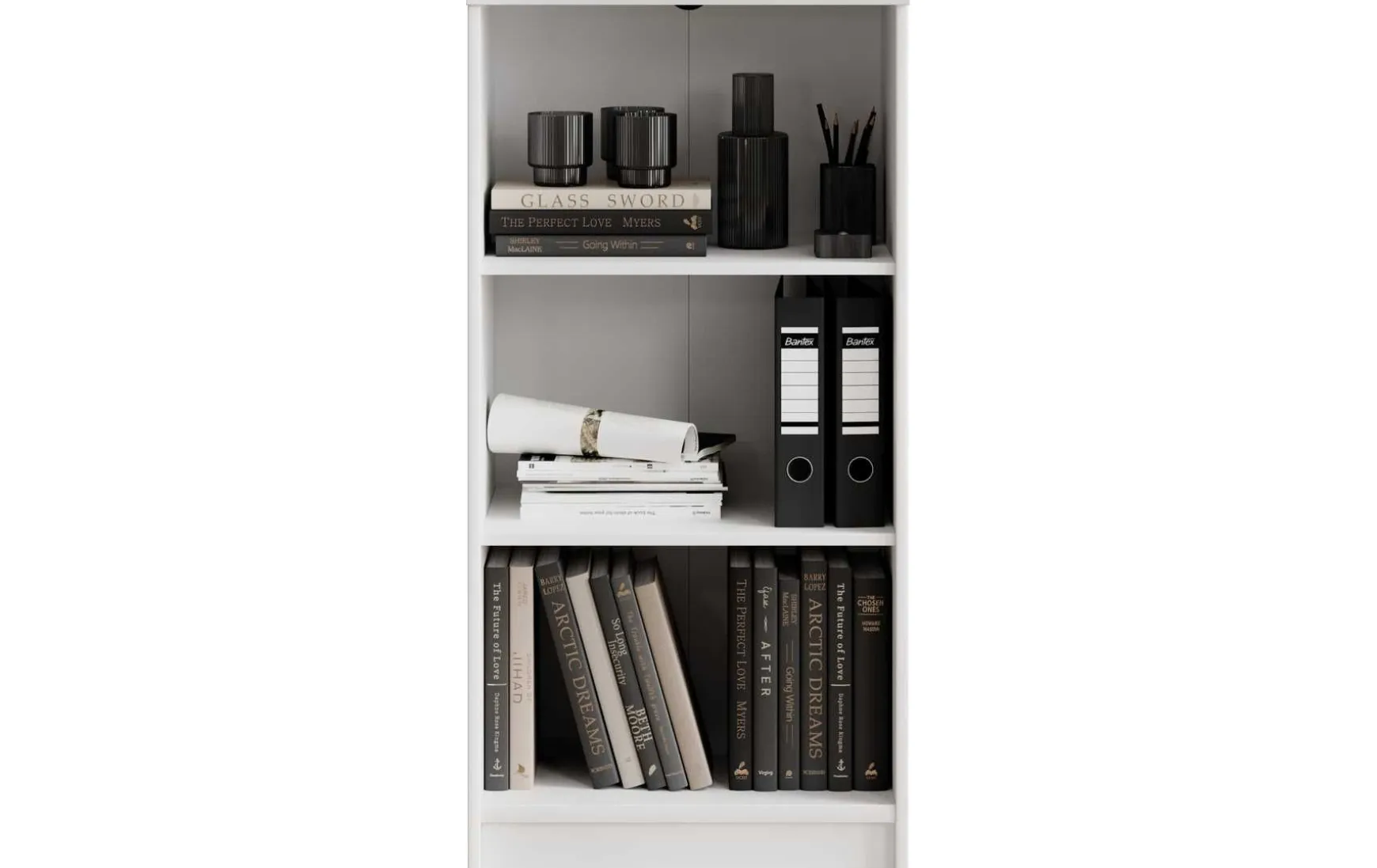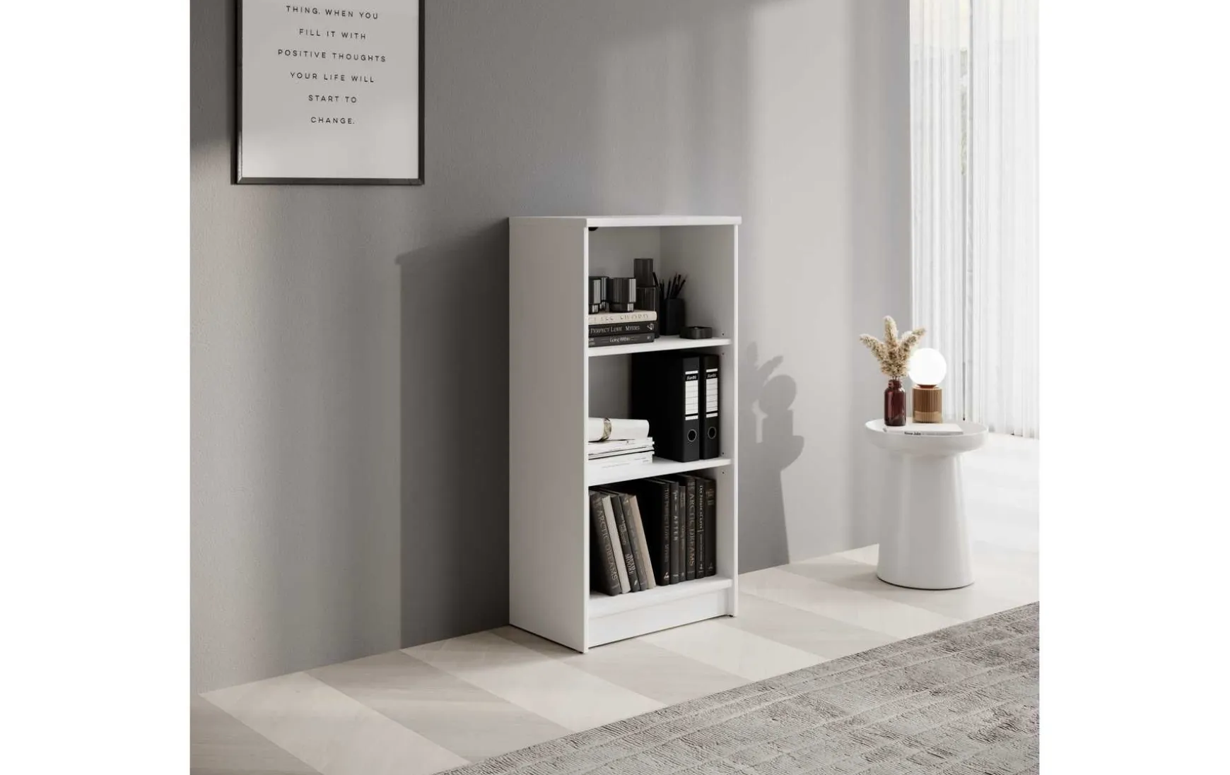 Das schmale Regal in Weiß Dekor besticht durch sein zeitloses und modernes Design und passt ideal in Wohnzimmer, Büro oder Schlafzimmer. Der Korpus aus melaminbeschichtetem Holzwerkstoff sorgt für eine pflegeleichte und robuste Oberfläche, während die schwarzen Kunststofffüße einen stilvollen Akzent setzen. Mit 3 offenen Fächern bietet das Regal praktischen Stauraum für Bücher, Ordner oder Dekoration. Dank seiner kompakten Maße von ca. 54 × 111 × 34 cm (B/H/T) lässt es sich auch in schmalen Nischen optimal nutzen. Zur Reinigung genügt ein trockenes Staubtuch, auf scheuernde oder lösungsmittelhaltige Reinigungsmittel sollte verzichtet werden. Das Regal wird zerlegt geliefert, Dekoration ist nicht im Preis enthalten.