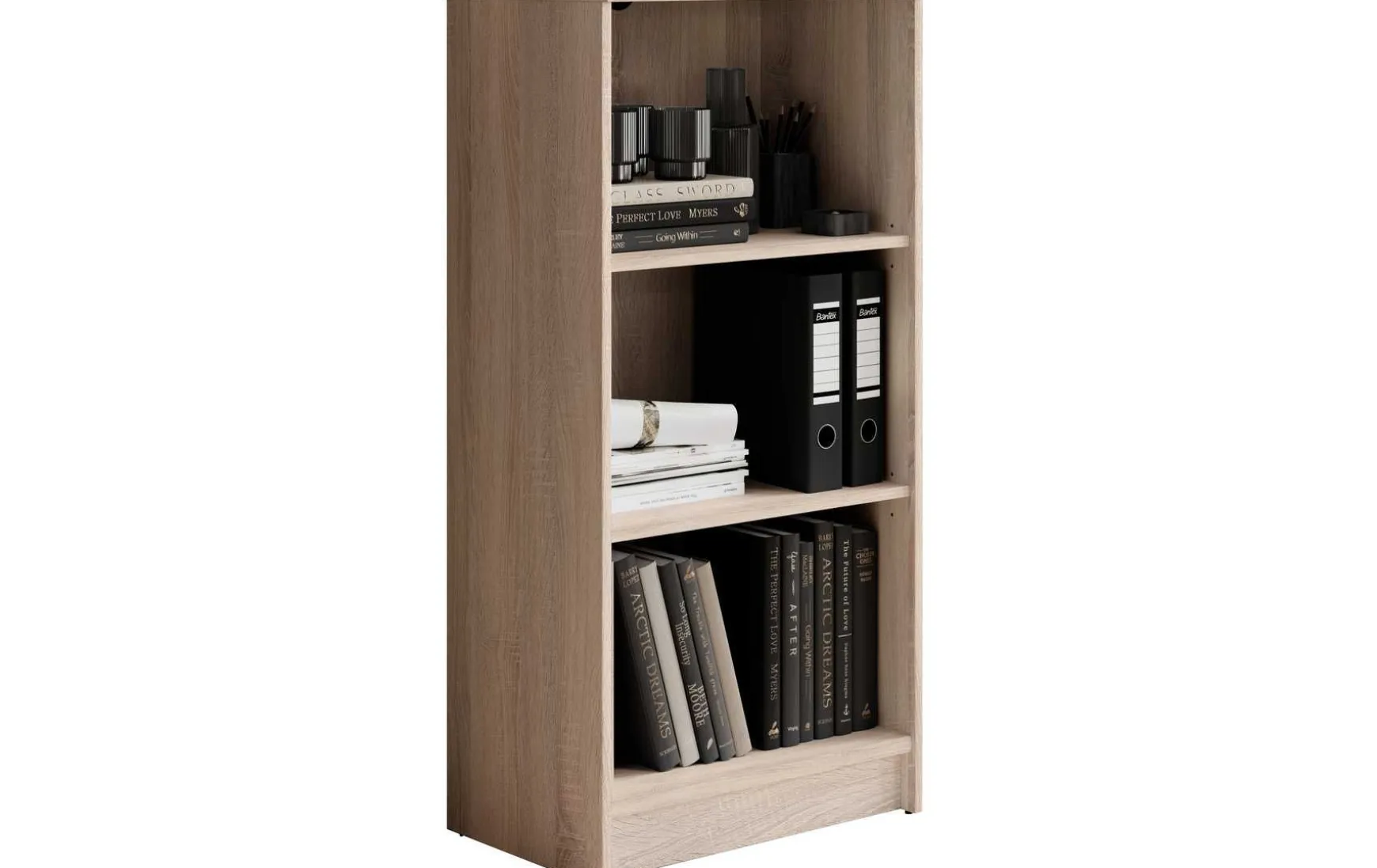 Das Regal im Eiche Sonoma Dekor überzeugt durch sein zeitloses, modernes Design und passt ideal in Wohnzimmer, Büro oder Schlafzimmer. Der Korpus aus melaminbeschichtetem Holzwerkstoff sorgt für eine pflegeleichte und robuste Oberfläche. Mit seinen 3 offenen Fächern bietet das Regal praktischen Stauraum für Bücher, Dekoration oder Ordner. Die Maße von ca. 54 × 111 × 34 cm (B/H/T) machen es kompakt und vielseitig einsetzbar. Schwarze Kunststofffüße setzen einen modernen Akzent und sorgen für einen stabilen Stand. Zur Reinigung genügt ein trockenes Staubtuch; auf lösungsmittelhaltige oder scheuernde Reinigungsmittel sollte verzichtet werden. Das Regal wird zerlegt geliefert und lässt sich einfach montieren.