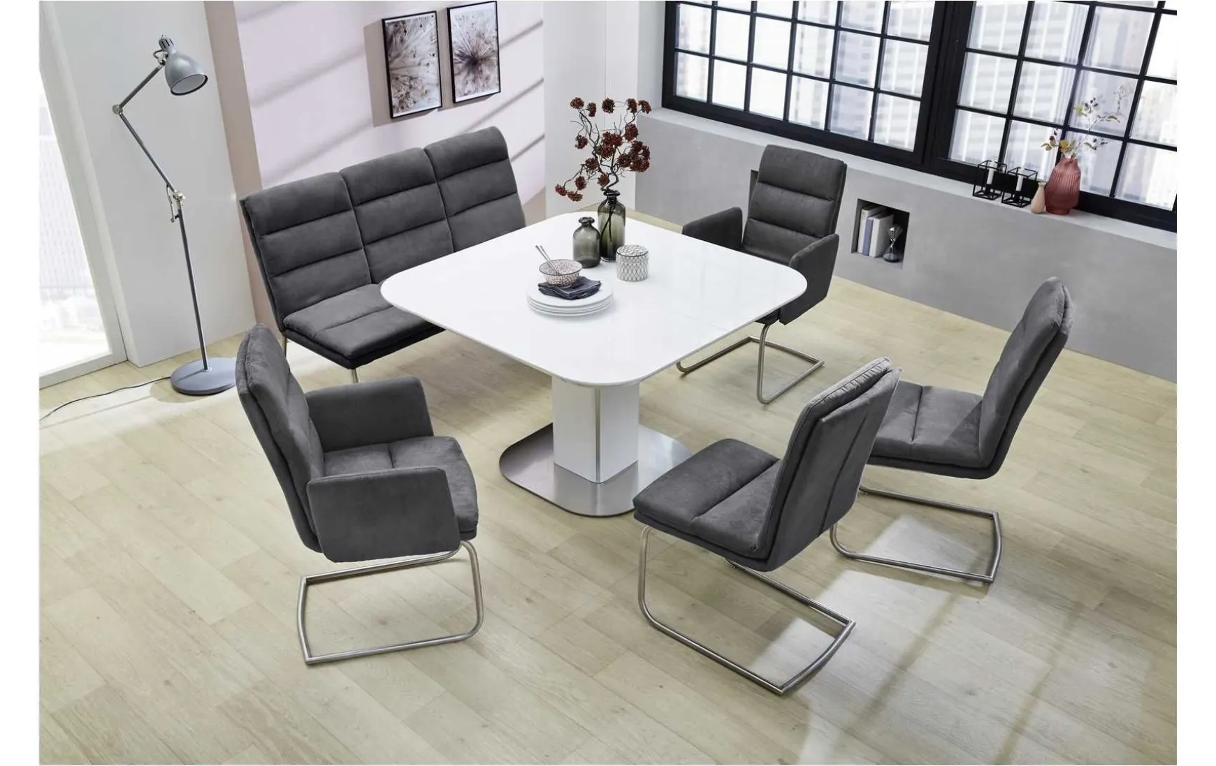 Dieser moderne Armlehnenstuhl in Anthrazit farbenen Microfaserbezug und sein Schwinggestell in Edelstahloptik machen ihn zu einem zeitlosen begleiter für Ihr Zuhause.