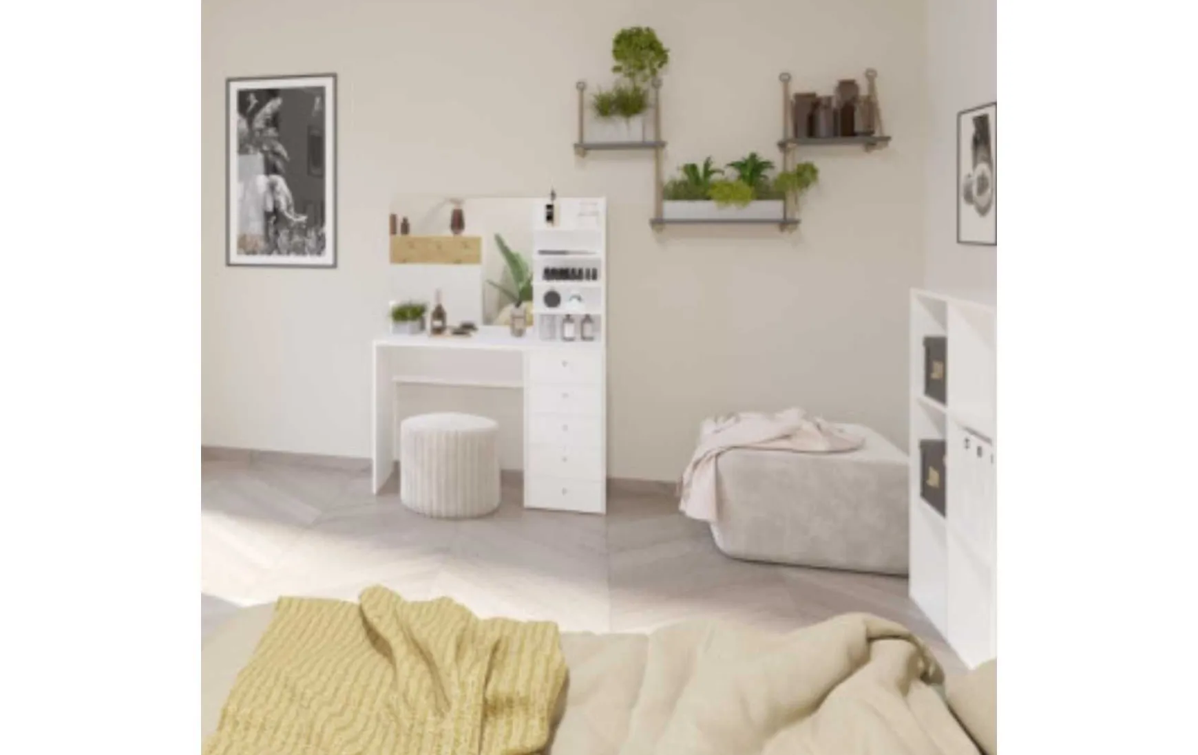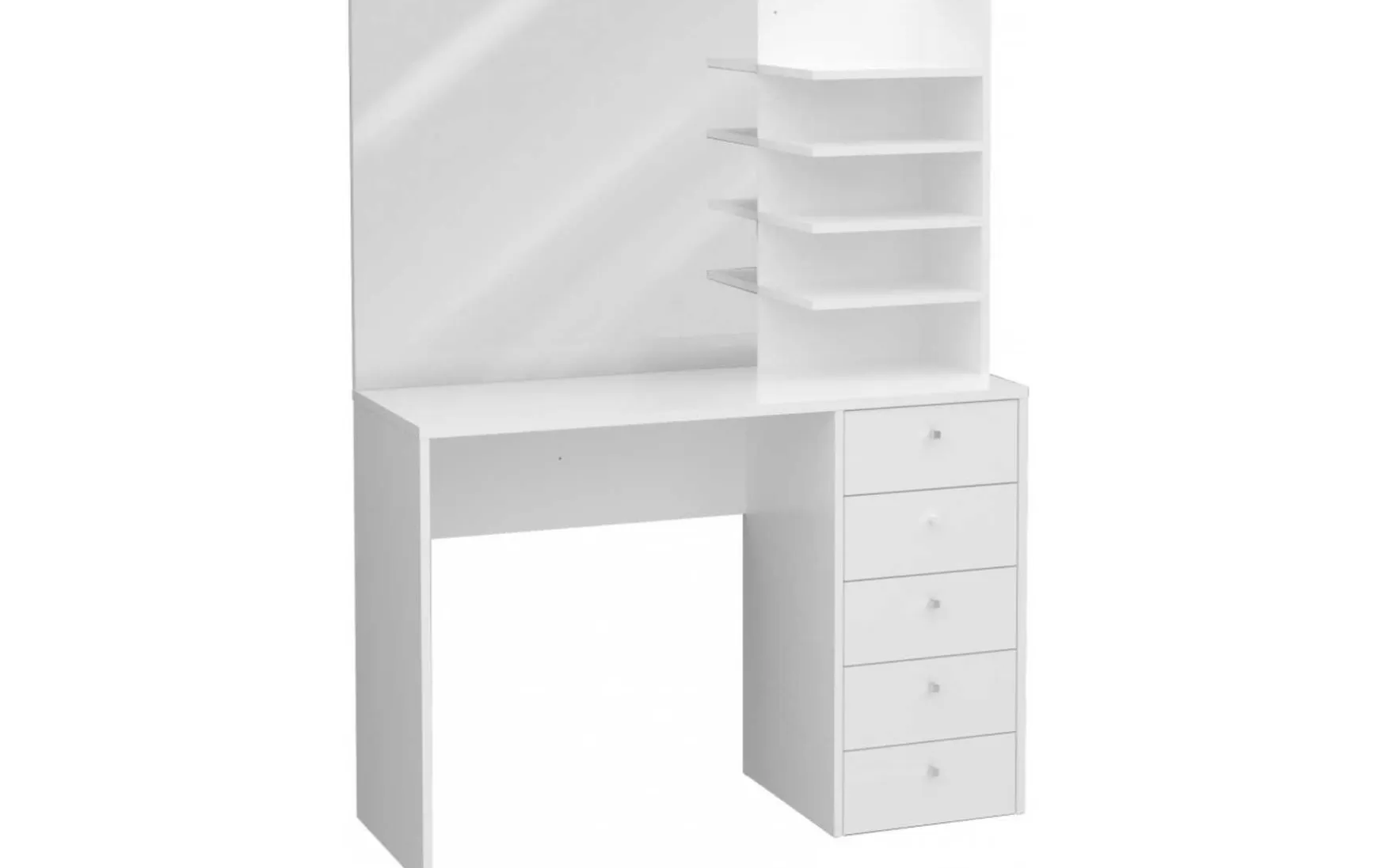 Trendiger Schminktisch mit Spiegel. Die seitlichen Ablageflächer schaffen zusätzlich Stauraum. Ausgestattet ist der Schminktisch mit 5 offenen Fächern sowie 5 Schubladen. Kugelgelagerte Metall – Laufschienen bei der Schublade und Metallbeschläge.