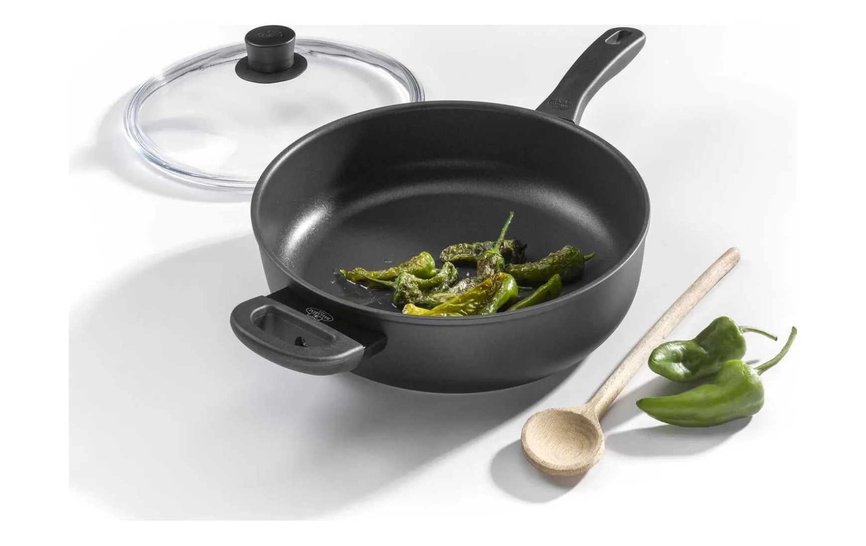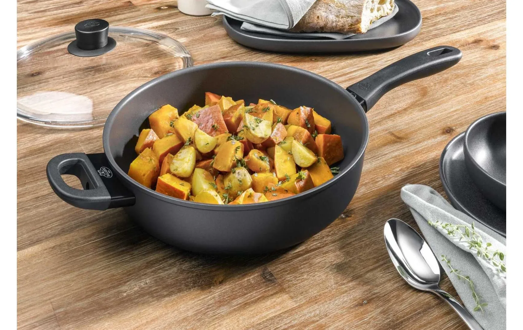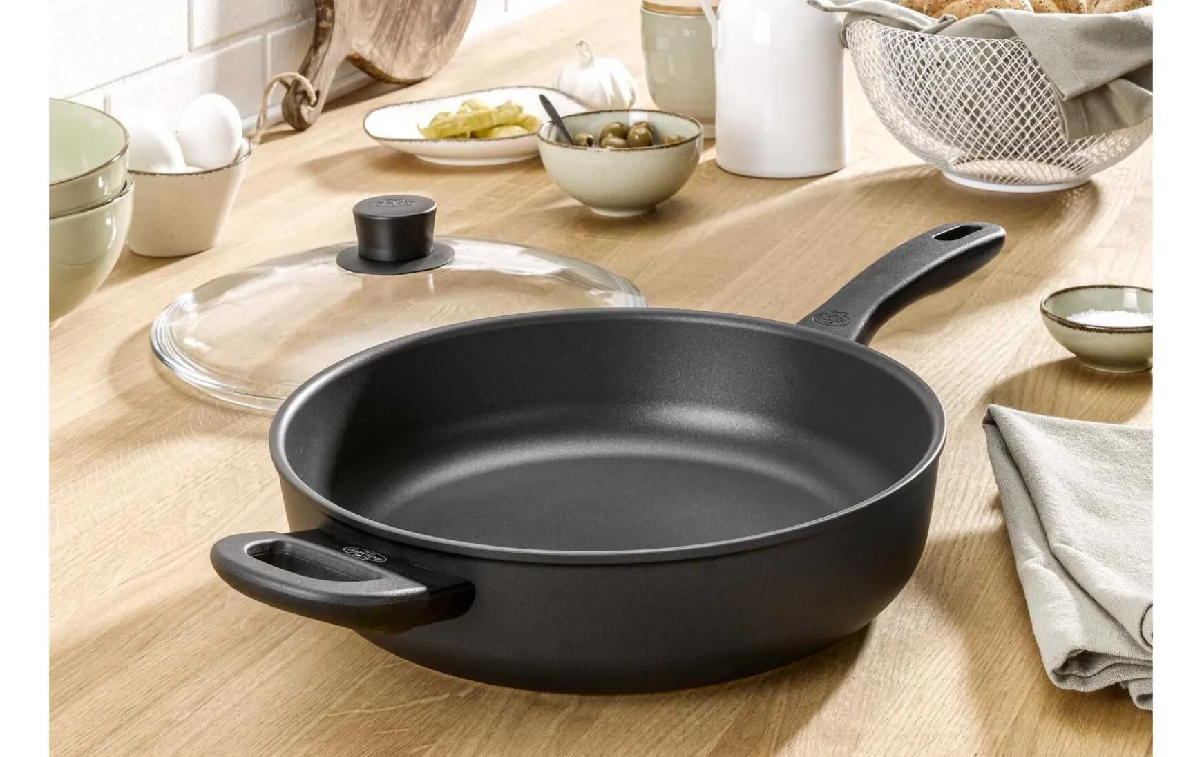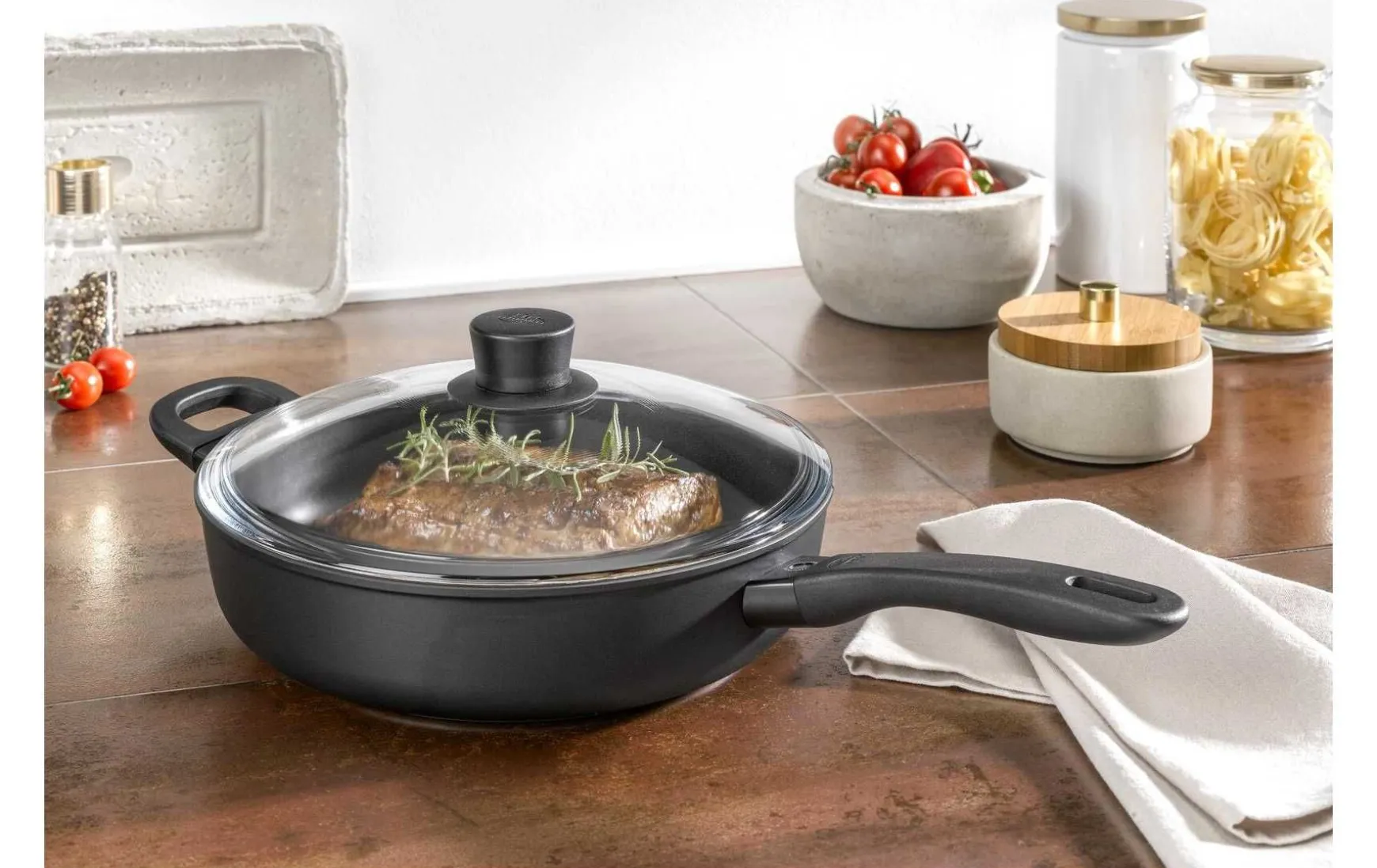 Diese Schmorpfanne mit Glasdeckel überzeugt durch ihre hochwertige und langlebige Antihaftbeschichtung. Der hohe Pfannenrand hilft beim scharfen anbraten, dann ermöglicht der Glasdeckel sanftes schmoren.