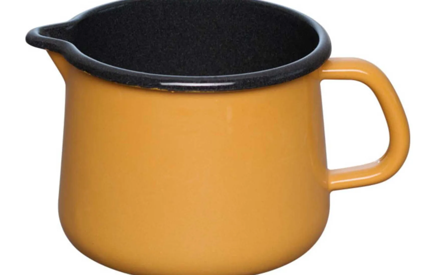 Bei uns heißen diese Milchtöpfe auch „Schnabeltopf“ wegen des charakteristisch geformten Ausguss, mit dem Flüssiges wie Milch, Wasser, Suppe, Saucen einfach eingegossen werden können. Mit seinem Rundgriff ist der Schnabeltopf auch gut um Flüssiges direkt am Tisch zu servieren. Der Rand ist rund geschwungen – Bördelrand in der Emaillesprache – dabei wird das Metall gebogen, um einen runden und stabilen Rand zu erzeugen. Dieser Milchtopf ist ein beliebter Helfer in der Küche.