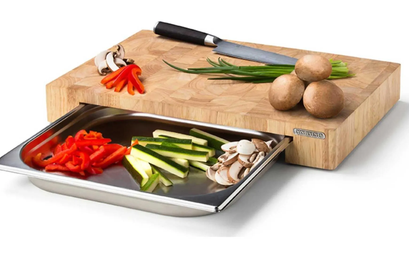Das Schneidebrett mit Edelstahl-Schublade aus Stirnholz ist besonders praktisch. Wenn Du fertig bist mit Schneiden, kannst Du das Kleingeschnittene oder den Abfall in der Edelstahlschublade ablegen. Die Schublade ist beidseitig entnehmbar. Das Holzbrett bietet sicheren Stand durch rutschfeste Gummifüße.
