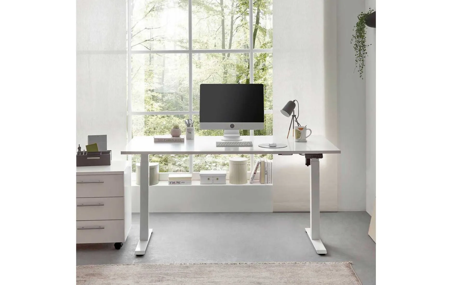 Der elektrisch höhenverstellbare Schreibtisch in Weiß vereint modernes Design mit ergonomischer Funktionalität und ist ideal für Büro oder Homeoffice. Die Tischhöhe lässt sich bequem bis auf ca. 117 cm anpassen, sodass sowohl Arbeiten im Sitzen als auch im Stehen möglich ist. Das massive Metallgestell sorgt für Stabilität, während die Tischplatte aus melaminbeschichteter Spanplatte eine pflegeleichte und robuste Arbeitsfläche bietet. Mit den Maßen von ca. 160 × 77 × 74 cm (B/T/H) bietet der Schreibtisch ausreichend Platz für Computer, Unterlagen und Arbeitszubehör. Die Montage ist leicht durchführbar, und der Schreibtisch wird zerlegt geliefert.