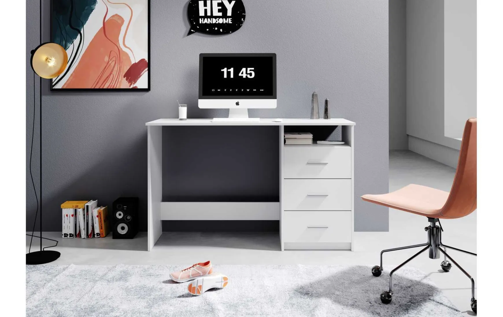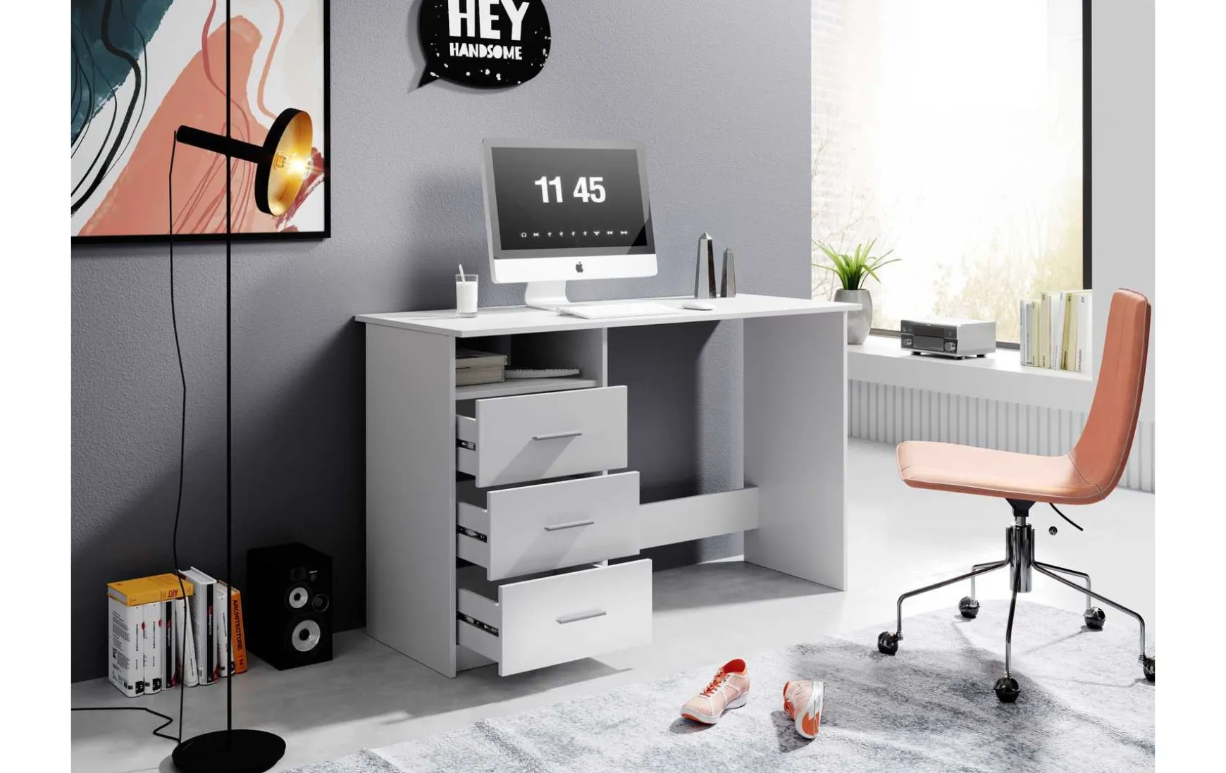 Der rechteckige Schreibtisch ist ideal für ein Jugendzimmer oder Büro geeignet. Er verfügt über drei geräumige Schubladen, die ausreichend Platz für Büromaterialien, Unterlagen und persönliche Gegenstände bieten. Die Griffe der Schubladen sind aus weißem Kunststoff gefertigt und passen perfekt zum modernen Design des Schreibtisches. Die einfache Montage ermöglicht es, den Schreibtisch schnell und unkompliziert aufzubauen, ohne dass spezielles Werkzeug erforderlich ist. Dank seiner stabilen Konstruktion und hochwertigen Materialien ist der Schreibtisch langlebig und robust. Mit seinem schlichten und zeitlosen Design fügt sich der Schreibtisch harmonisch in jedes Jugendzimmer oder Büro ein und bietet eine praktische Arbeitsfläche für Hausaufgaben, Arbeiten am Computer oder kreative Projekte.