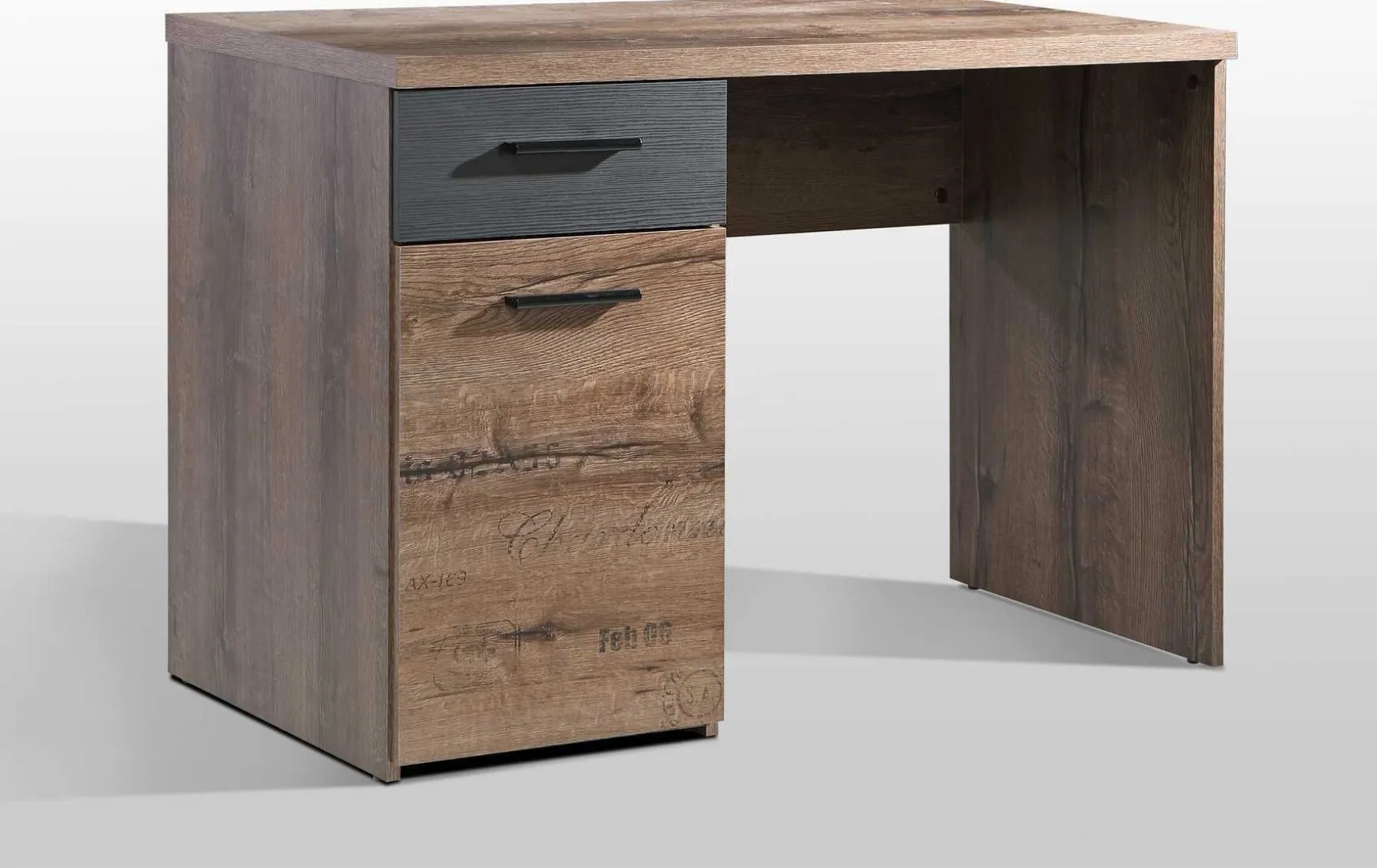 Dieser stylische Schreibtisch im modernen Design überzeugt durch seine elegante Kombination aus Schlammeiche-Dekor und Schwarz-Eiche und passt perfekt in Arbeitszimmer, Homeoffice oder Jugendzimmer. Die rechteckige Tischform bietet eine komfortable Arbeitsfläche, während das zeitgemäße Design eine moderne Atmosphäre schafft. Der Schreibtisch verfügt über eine Tür, eine Schublade und zwei offene Fächer, wodurch ausreichend Stauraum für Dokumente, Büromaterial und persönliche Gegenstände entsteht. Die Schublade auf Metalllaufleisten sorgt für ein leichtgängiges Öffnen und Schließen. Gefertigt aus robuster Spanplatte mit melaminharzbeschichteter Oberfläche, ist der Tisch langlebig und pflegeleicht – die Oberfläche lässt sich einfach trocken abwischen. Die Schubladenfront in Schwarz-Eiche aus kontrolliert nachhaltiger Forstwirtschaft setzt dabei einen stilvollen Akzent. Mit seinen Maßen von ca. 110 × 52,7 × 76,5 cm (B/T/H) bietet der Schreibtisch ausreichend Platz zum Arbeiten, ohne zu viel Raum einzunehmen. Der Schreibtisch wird zerlegt geliefert und lässt sich einfach montieren.