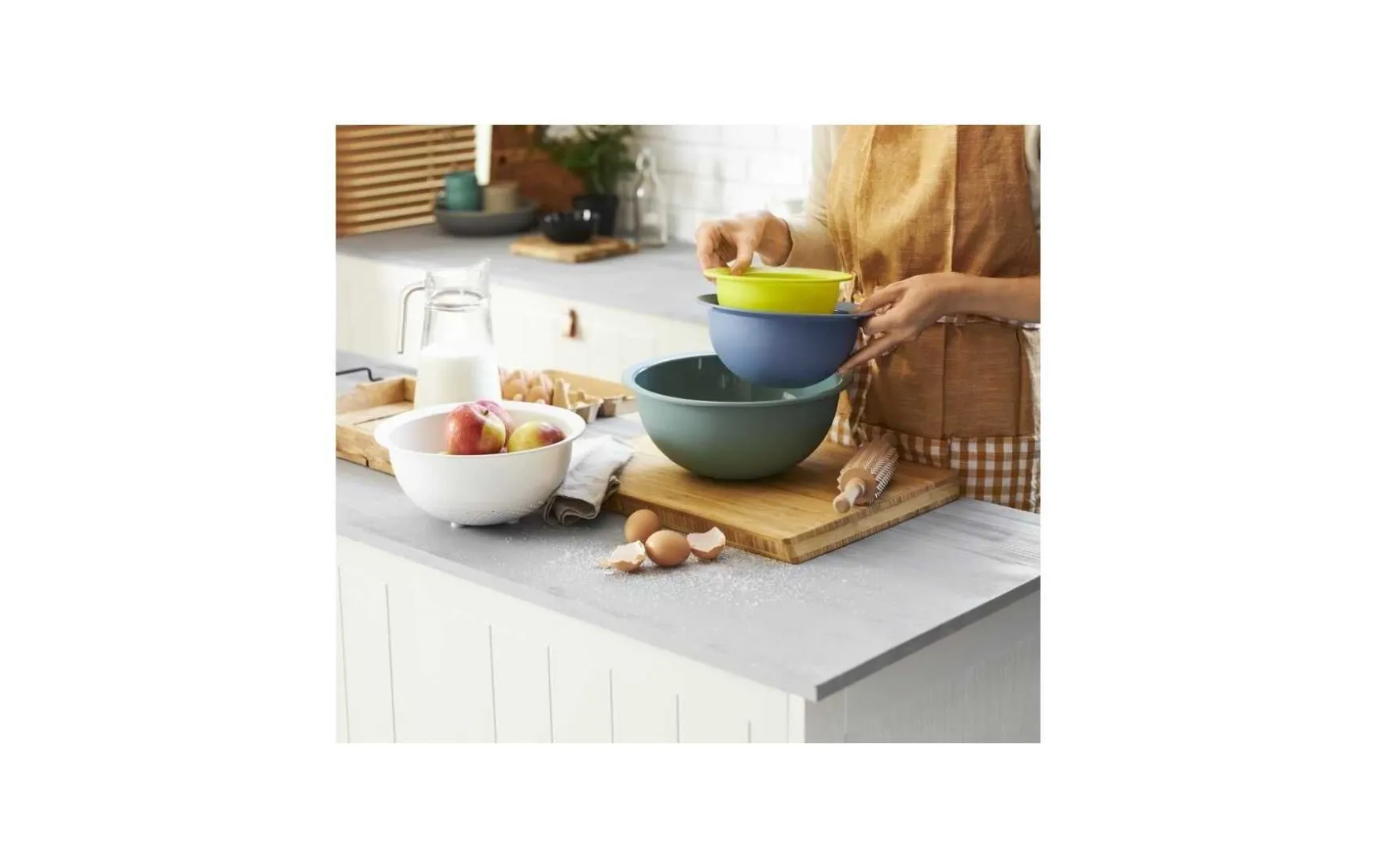 In diesem farbenfrohen Set finden Sie platzsparend verstaut alles für den täglichen Gebrauch, was Sie an Schüsseln und Sieb brauchen. Alle Basics für den täglichen Bedarf vereint – das ist das platzsparende und formschöne Schüssel-Siebset. Set mit 3 Schüsseln und einem Sieb – praktisch und schön. Die gerundete Form der Schüssel ist nicht nur zum Kneten von Teig ideal. Zusammen mit dem Sieb erlaubt sie ein direktes Servieren von Salat und Pasta von der Küche direkt auf den gedeckten Tisch.
