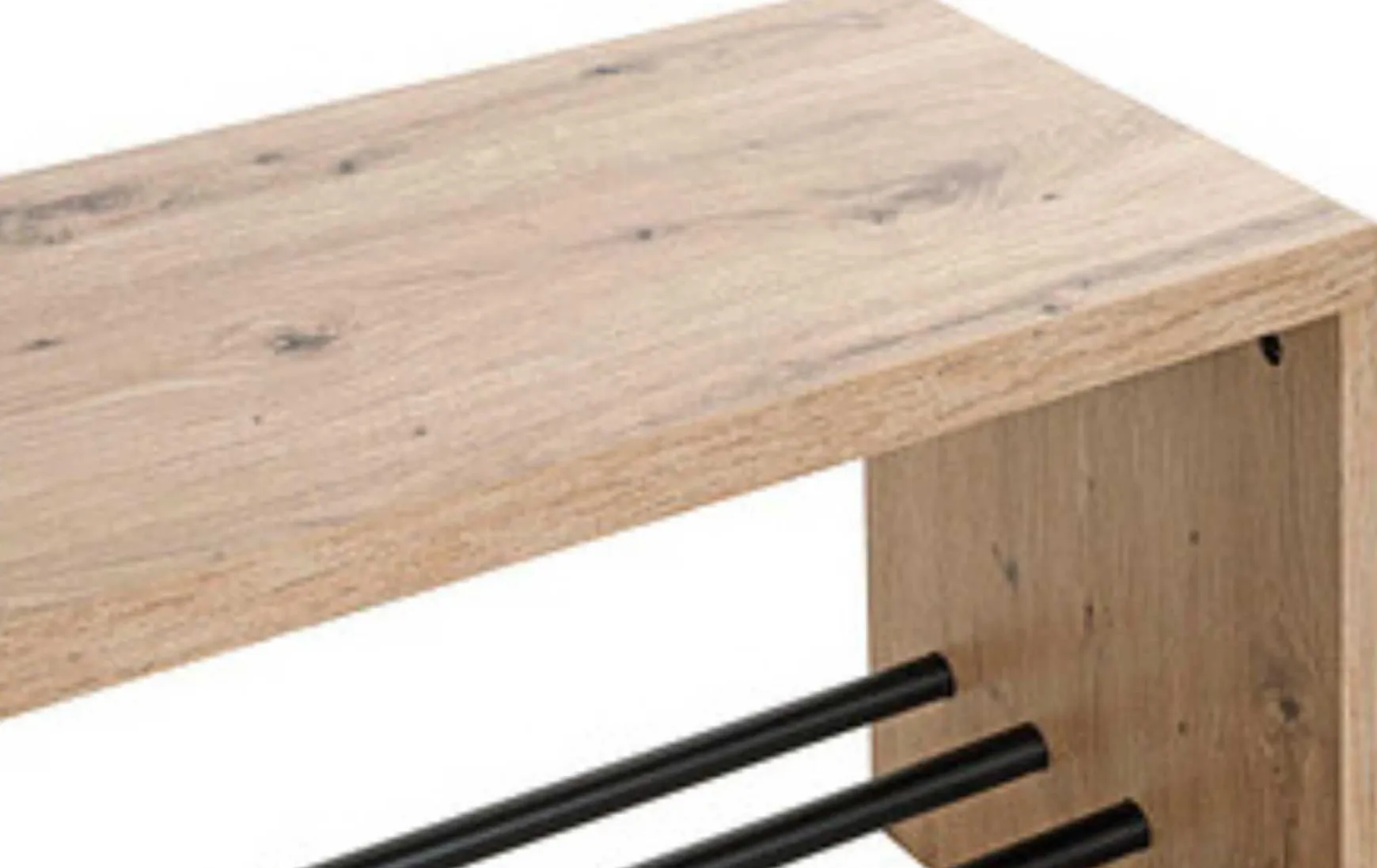 Die schlichte Schuhbank in Eiche-Optik verbindet praktischen Nutzen mit zeitlosem Design und ist ideal für Flur oder Eingangsbereich. Sie bietet Platz für bis zu drei Paar Schuhe und dient gleichzeitig als bequeme Sitzgelegenheit. Dank der stabilen Konstruktion ist die Schuhbank bis zu ca. 85 kg belastbar und überzeugt durch hohe Alltagstauglichkeit.