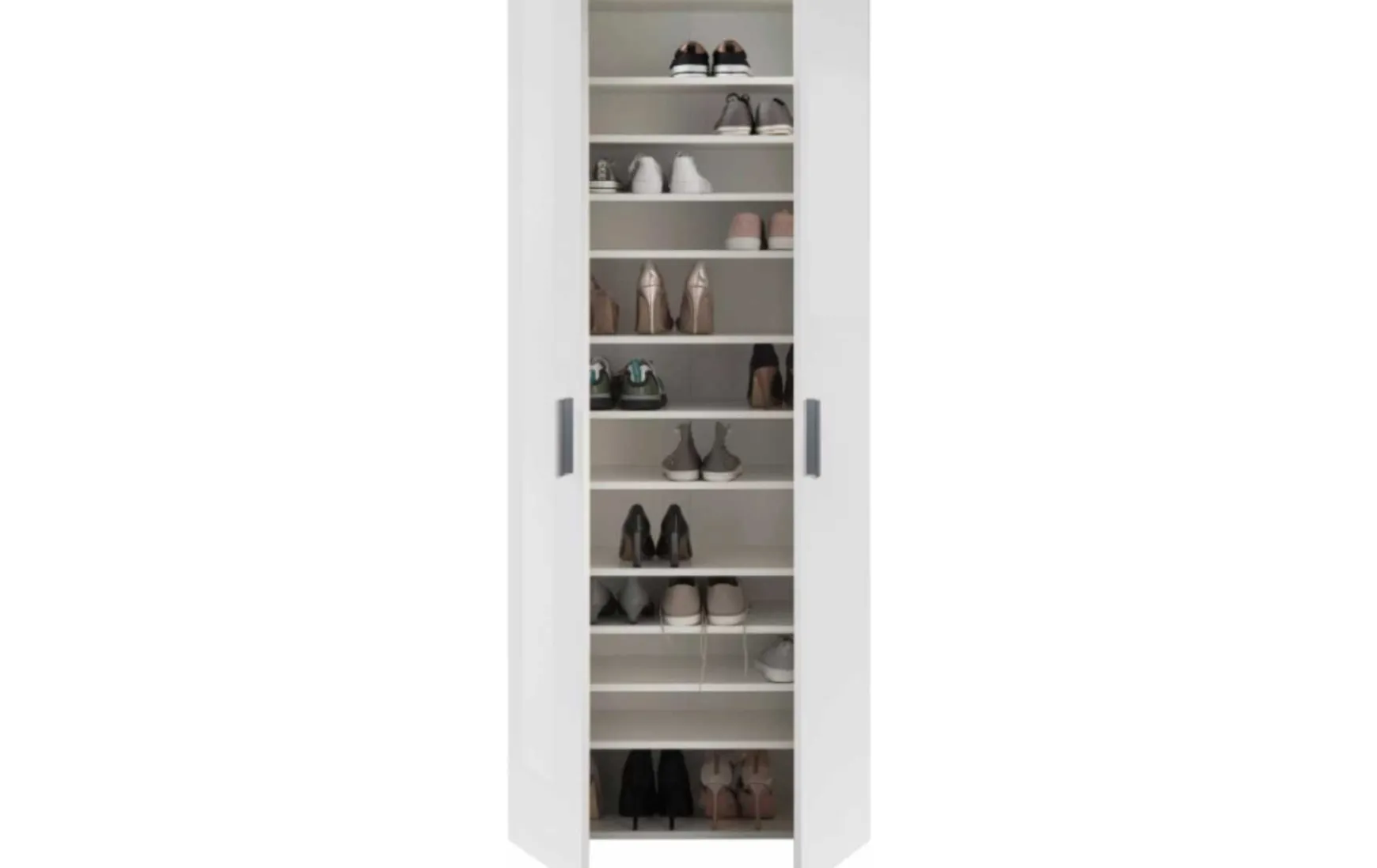 Mit den Maßen ca. 80 x 190 x 35 cm (B x H x T) bietet der hohe Schrank ausreichend Platz, um Schuhe übersichtlich einzuordnen und auf den ersten Blick zu wissen, welche besonders gut zum aktuellen Outfit passen. Von den elf Einlegeböden sind neun verstellbar. Damit können Sie den Schrank an Ihre Bedürfnisse anpassen und auch Overknees oder Gummistiefel finden einfach Platz. Die Böden haben eine Stärke von etwa 16 mm und sind mit je ca. drei kg belastbar.
