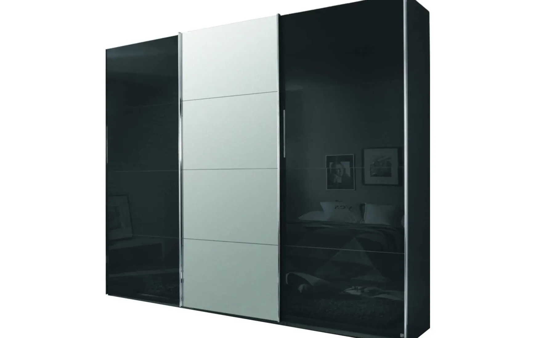 Moderner Schwebetürenschrank. Mittlere Tür mit Spiegel. Griffleisten aus Metall. Innendekor Leinenoptik hell. Pro Element ein Fachboden & eine Kleiderstange.