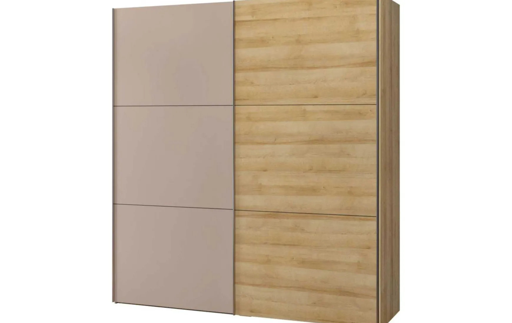 Harmonische Farben und klare Linien verleihen dem kompakten Schwebetürenschrank eine zeitlose und wohnliche Ausstrahlung. Zum Korpus in Eichenstruktur-Holznachbildung passt die attraktiv gestaltete Front perfekt. Eine Tür besteht aus drei Paneelen in Eichenstruktur-Optik, die andere aus Glas im eleganten Farbton Nougat matt. Die schöne Maserung und die glatte Glasfläche bilden einen reizvollen Kontrast. Ein edelstahlfarbenes Clipprofil vervollständigt den zweitürigen Schrank. Zudem sind zwei Kleiderstangen – jeweils eine pro Teil – inbegriffen, um die eigene Garderobe und modische Accessoires zu verstauen.