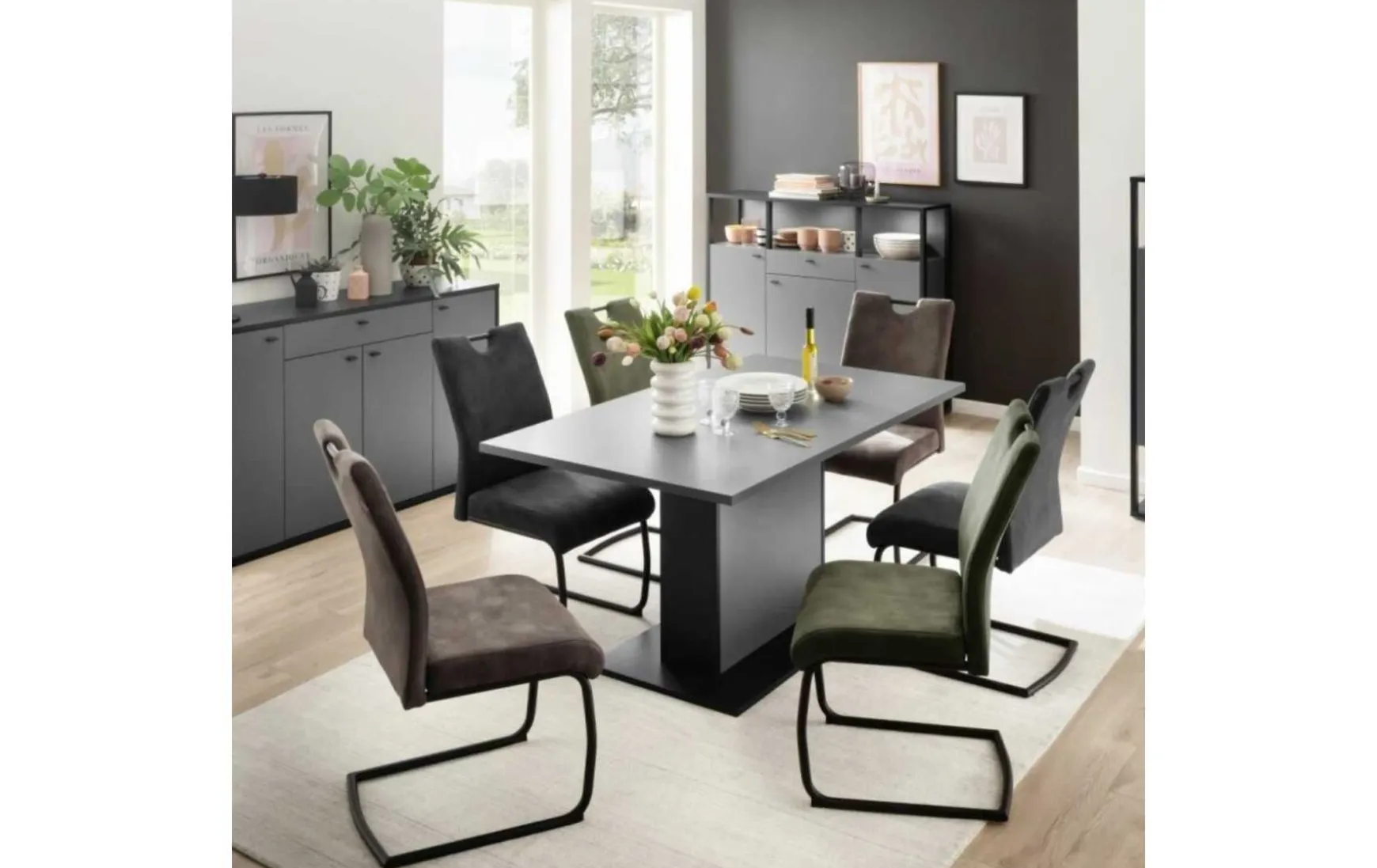 Dieser Schwingstuhl im stilvollen Antiklook vereint markantes Design mit hohem Sitzkomfort. Der olivgrüne Stoffbezug verleiht dem Stuhl eine warme, elegante Ausstrahlung, während das schwarze, mattierte Metallgestell in Rundrohr-Ausführung für Stabilität und eine moderne Note sorgt. Dank der angenehmen Schwingfunktion passt sich der Stuhl flexibel den Bewegungen an und bietet ein komfortables Sitzerlebnis. Mit einer maximalen Belastbarkeit von ca. 150 kg eignet sich der Schwingstuhl ideal für den täglichen Einsatz im Esszimmer oder Wohnbereich. Vormontiert geliefert, ist er sofort einsatzbereit.